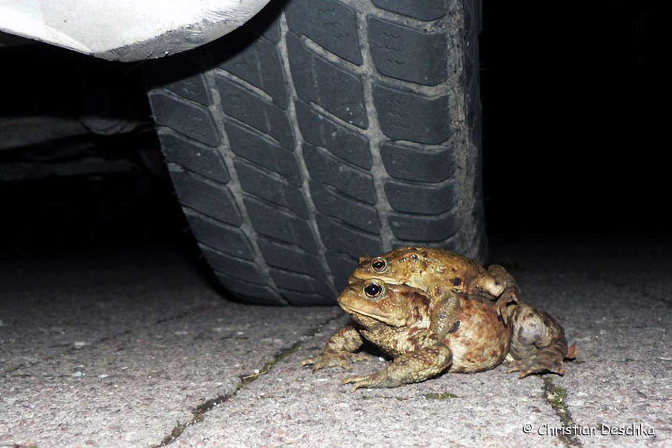 Selbst relativ häufige Arten wie die Erdkröte können unsere Hilfe gebrauchen. Für sie wird vor allem die Laichwanderung im Frühling zum Problem. Dann kommen sie oft auf den Straßen unter die Räder.
