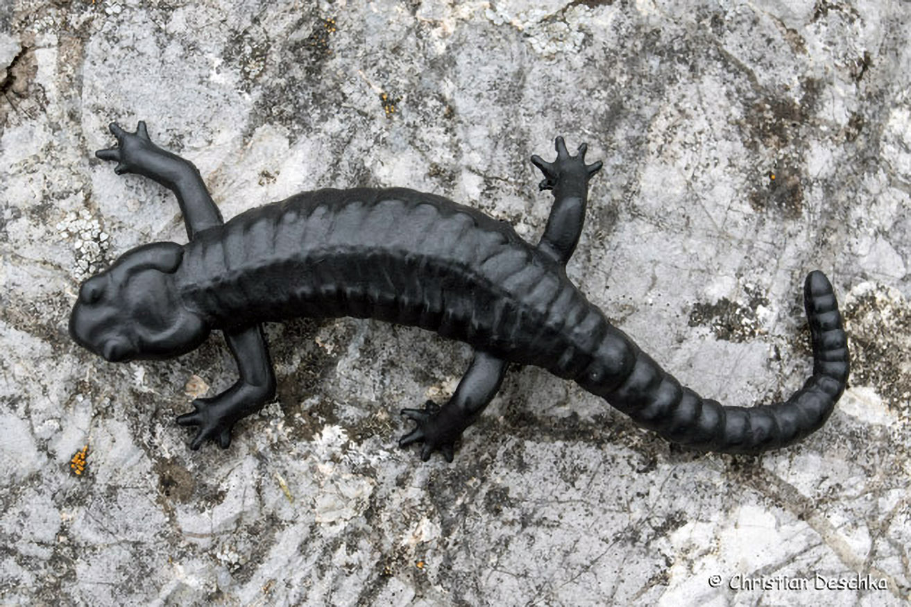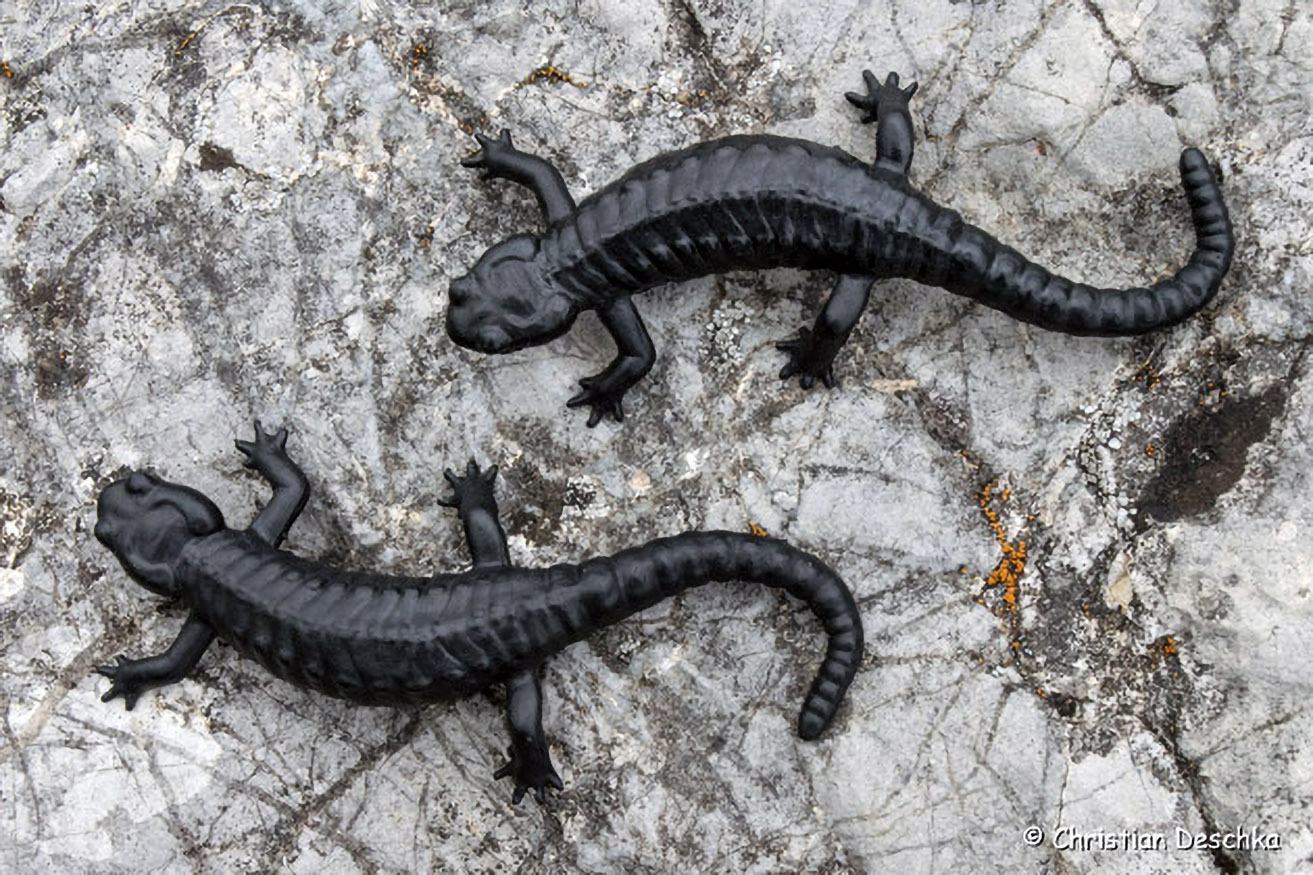 Der Schriftzug www.naturimbild.at/Alpensalamander am Bauch der Modelle verweist auf den Alpensalamanderbeitrag auf dieser Internetseite. Der online-Vortrag vermittelt Wissenswertes über Lebensweise, Gefährdung und Schutz des "Bergmännchens".