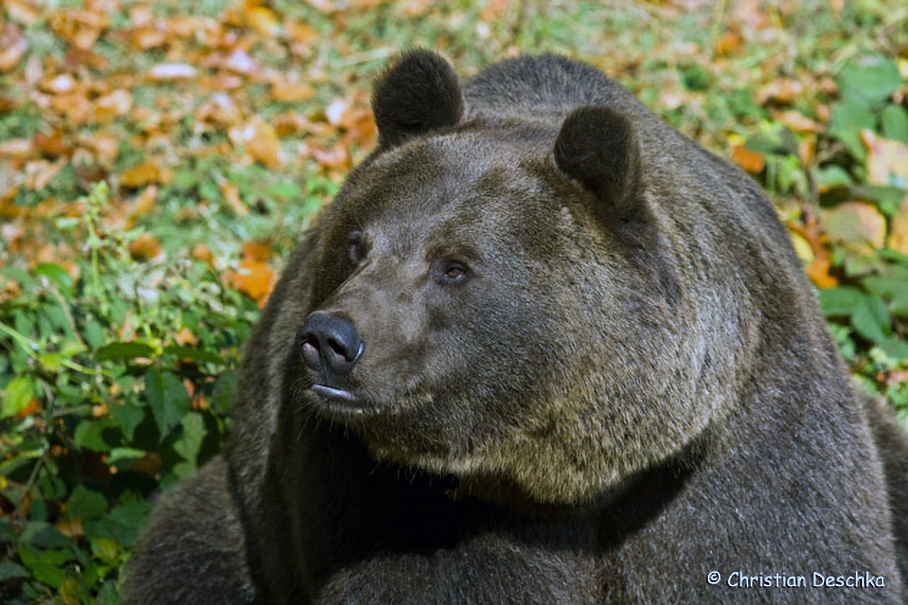 Der massige Körper und der dicke Kopf mit den rundlichen Gehören geben dem Braunbären sein charakteristisches Aussehen. Braunbären sind Raubtiere, deren Nahrung einen hohen pflanzlichen Anteil hat (Allesfresser!).