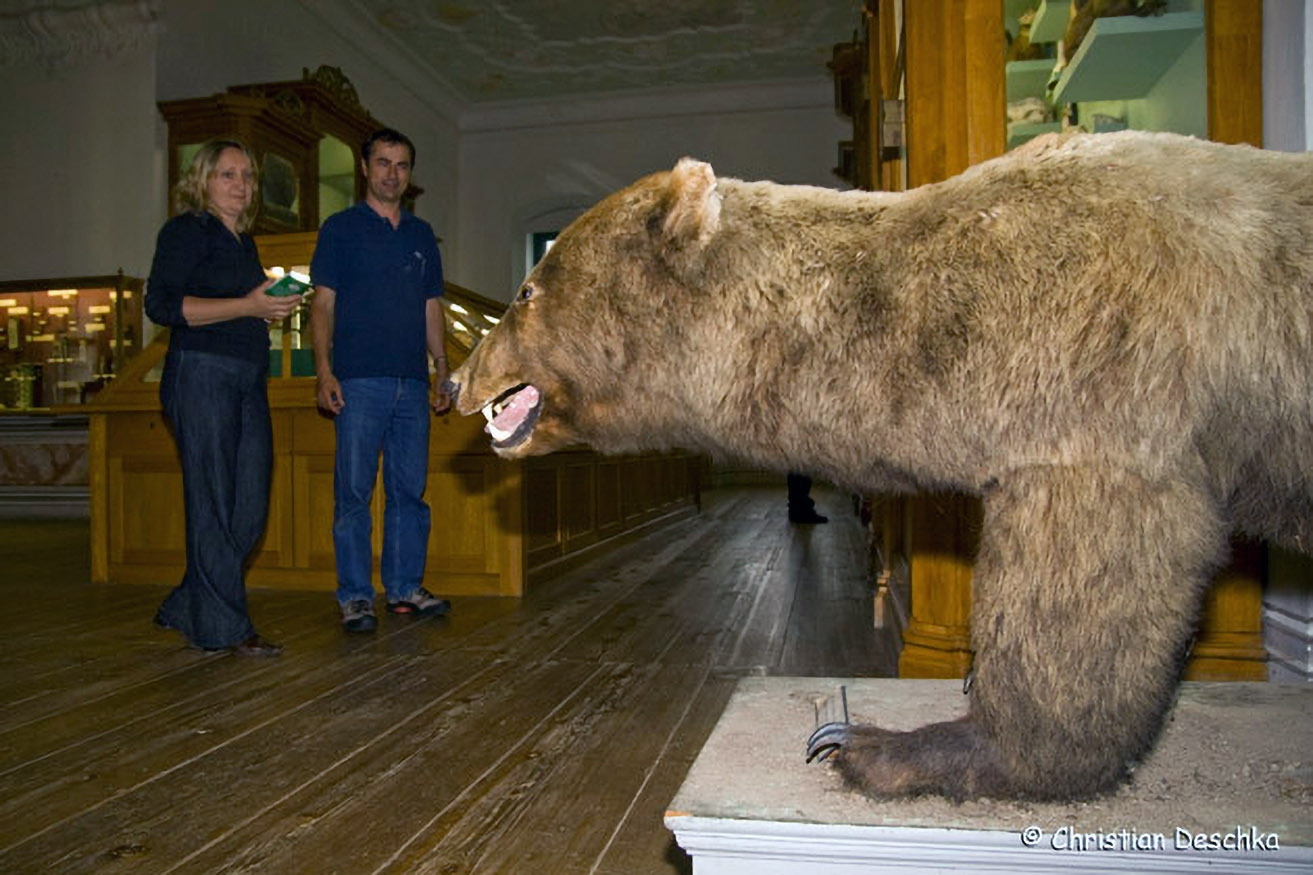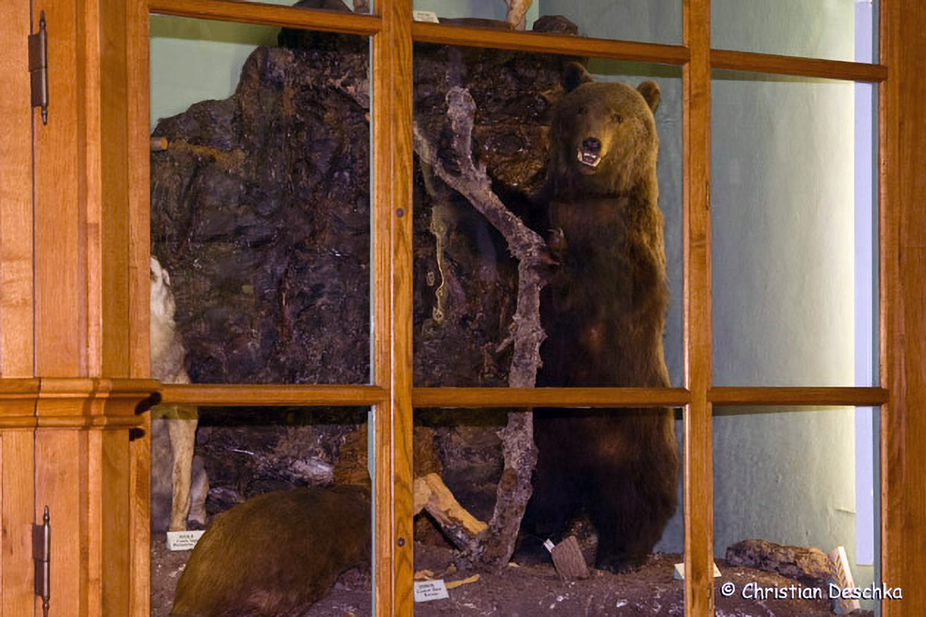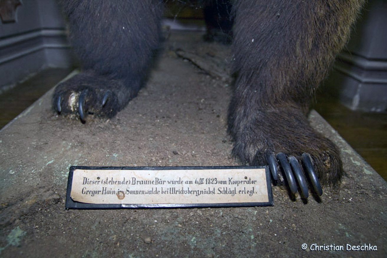 Und hier sehen wir das Präparat des letzten Mühlviertler Braunbären. Er wurde 1833 im Böhmerwald erschossen.