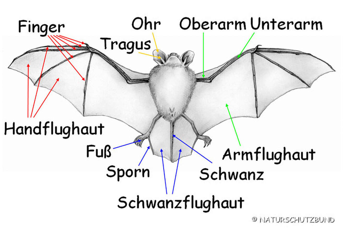 Fledermäuse sind die einzigen Säugetiere, die aktiv fliegen können. Der Bau der Flügel hängt vom bevorzugten Lebensraum ab: Schnelle Flieger des freien Luftraums haben lange und schmale Flügel, Waldbewohner hingegen kurze und breite.