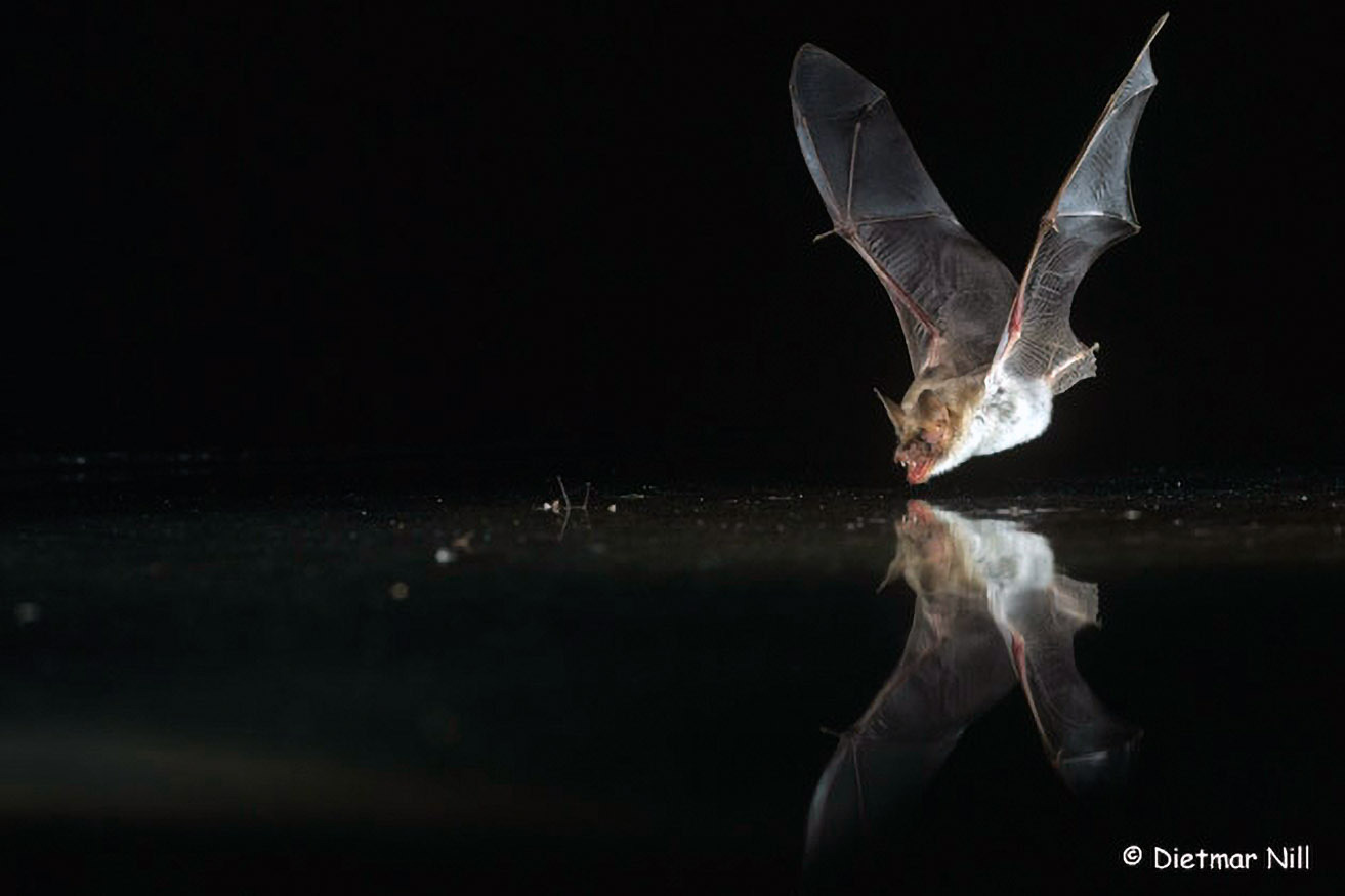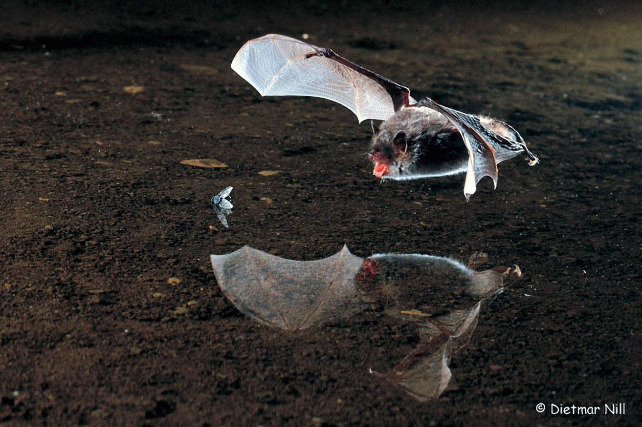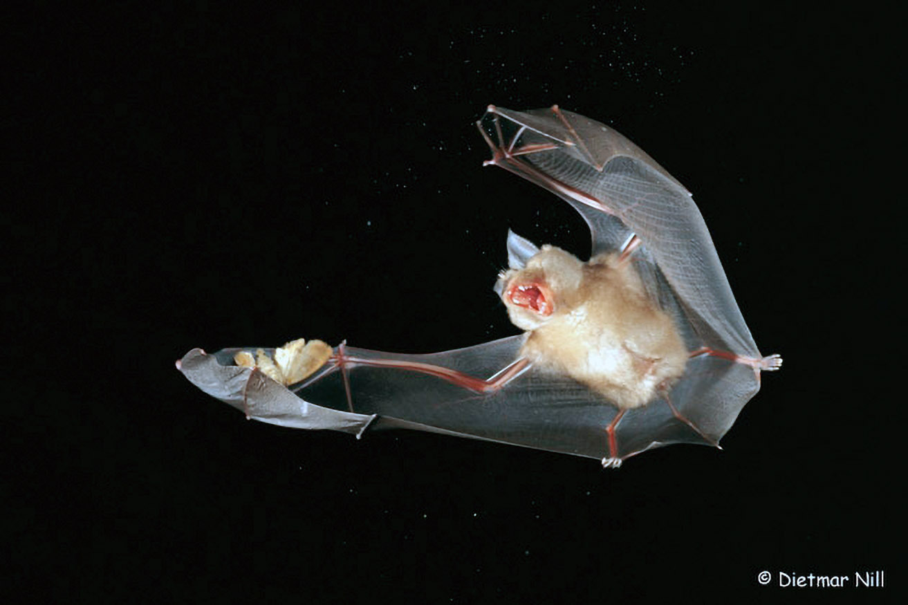Es wäre für Fledermäuse extrem schwierig, Beutetiere im Flug direkt mit dem kleinen Mund zu fangen. Deshalb schnippen sie die Insekten oft mit den viel größeren Flügeln in die Schwanzflughaut und nehmen sie von dort im Flug mit dem Mund auf.