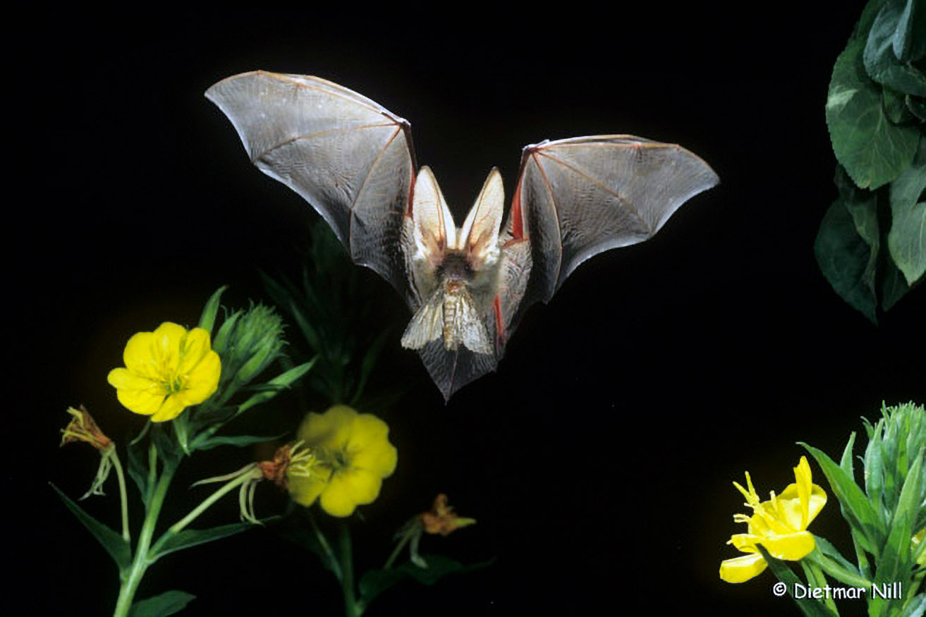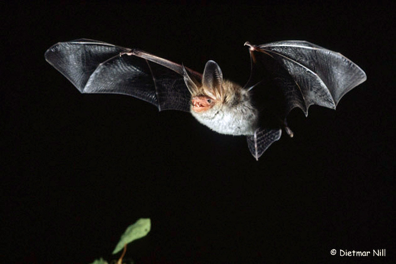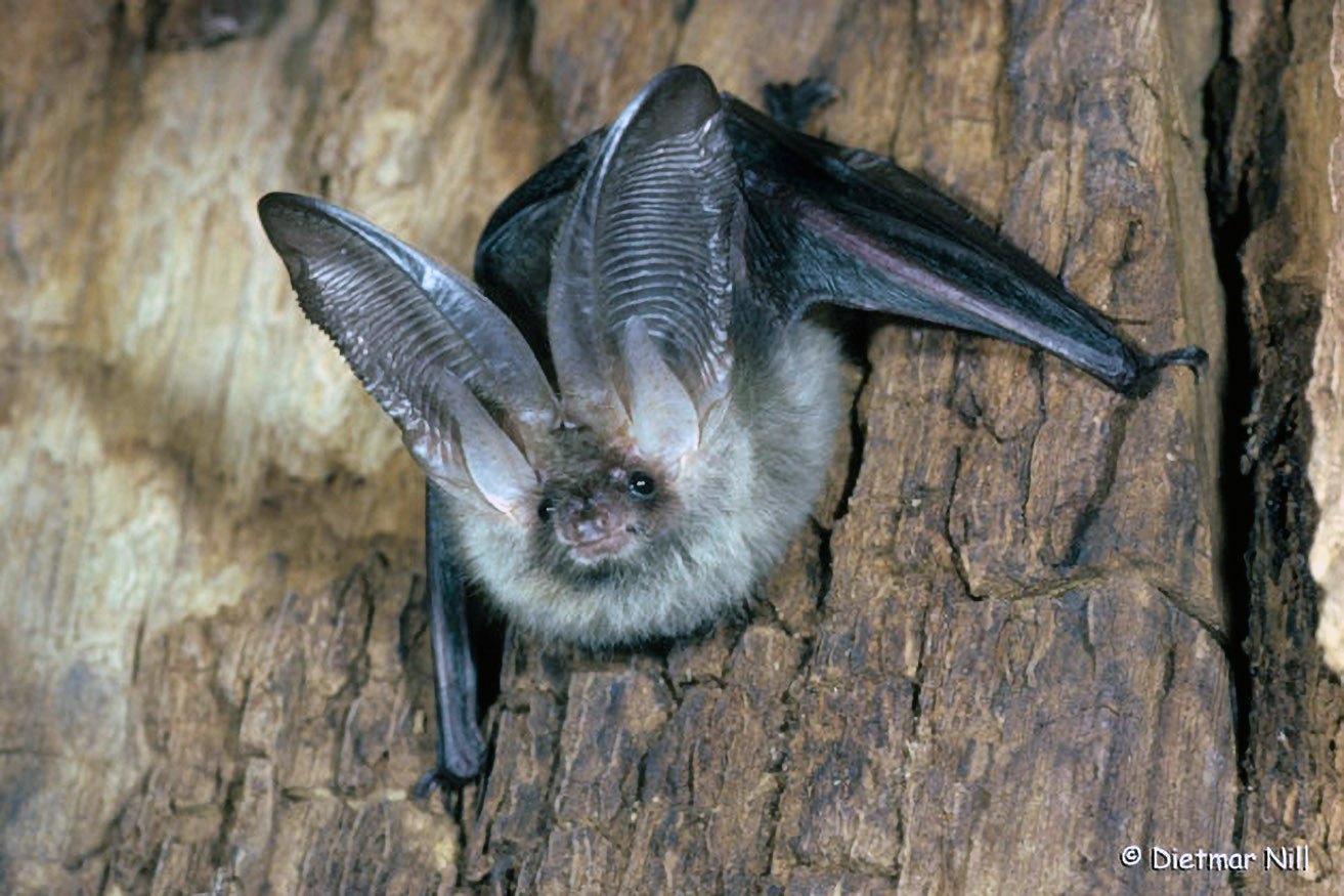 Die seltene Bechsteinfledermaus bewohnt gerne Baumhöhlen in Wäldern und Streuobstwiesen. Mit den kurzen und breiten Flügeln kann sie selbst in dichter Vegetation bestens manövrieren.