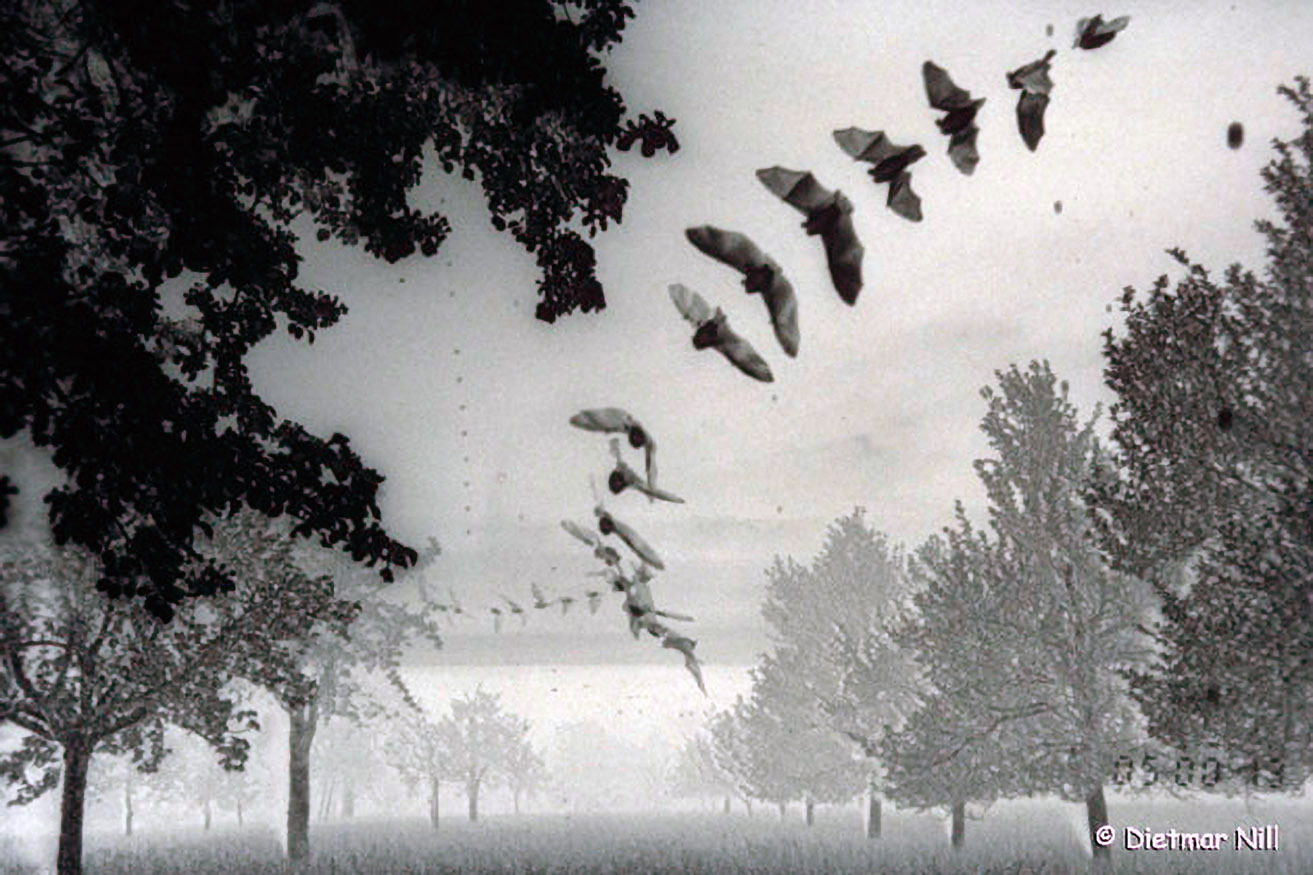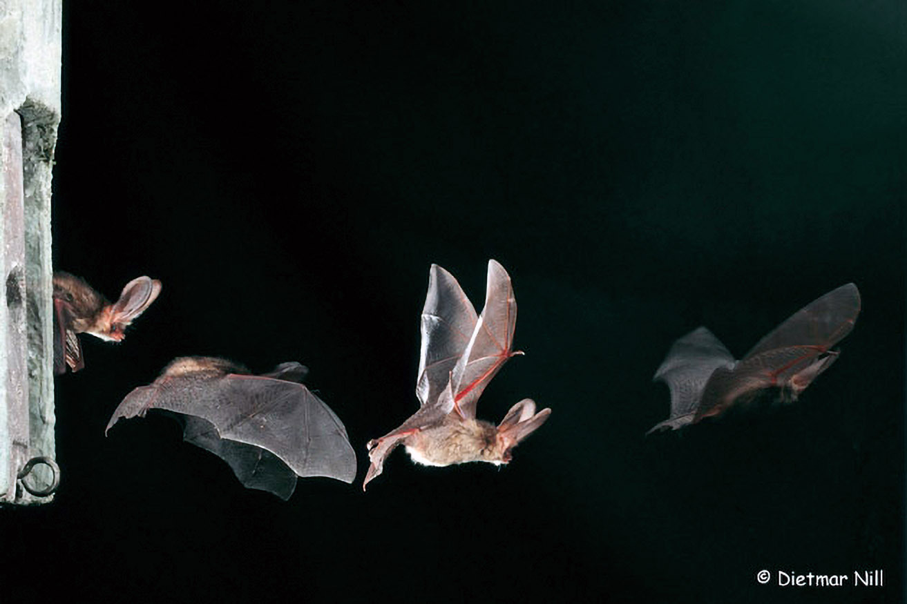 Zur Orientierung und Beuteortung stoßen Fledermäuse laute, für uns Menschen aber nicht hörbare Ultraschallrufe aus, deren Echo sie auswerten. Mit diesem Nahsinn können sie sich auch bei kompletter Dunkelheit zurechtfinden.