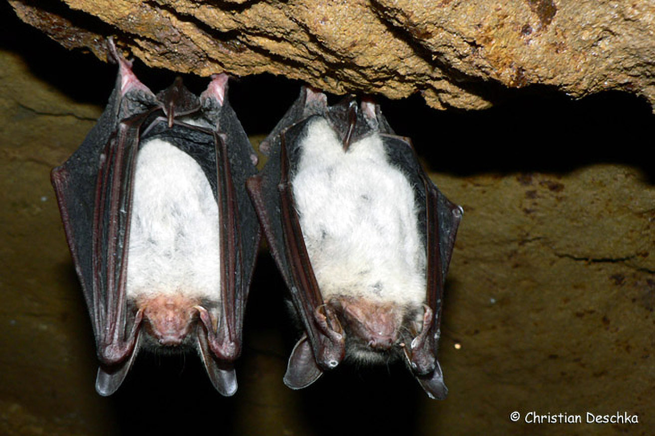 Die Zweifarbfledermaus hat eine weiße Unterseite und eine schwärzliche Oberseite. Diese ursprünglichen Felsspaltenbewohner beziehen heute gerne ihr Quartier an menschlichen Gebäuden. Im Herbst wird man durch Balzrufe und -flüge auf die Tiere aufmerksam.