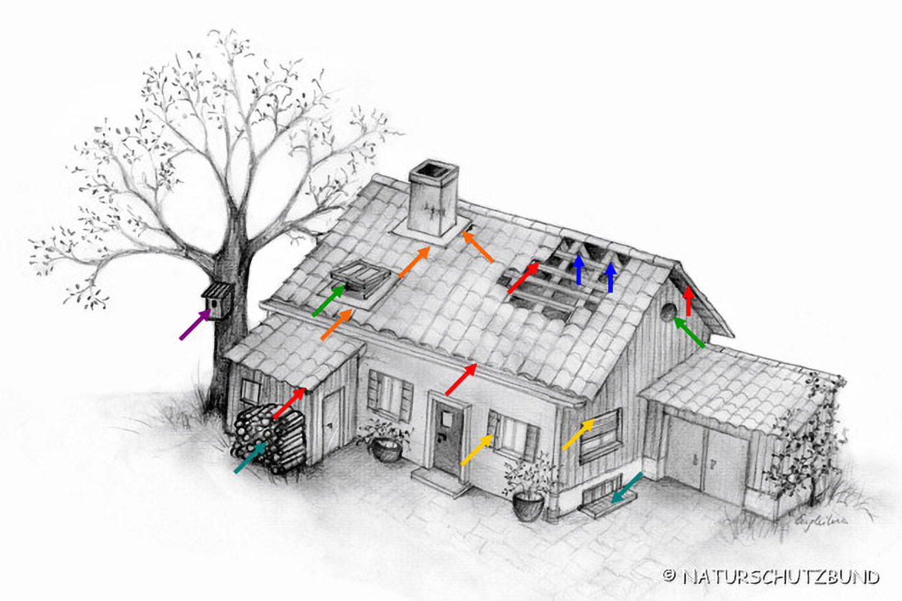 Auch an Privatgebäuden finden viele Fledermausarten ein Sommerquartier: z.B. im Dachboden (frei hängend oder in Spalten und Löchern), unter Dachziegeln und Kamineinfassungen, hinter Fensterläden, in Jalousienkästen, in Holzstößen, in Vogelnistkästen, ...