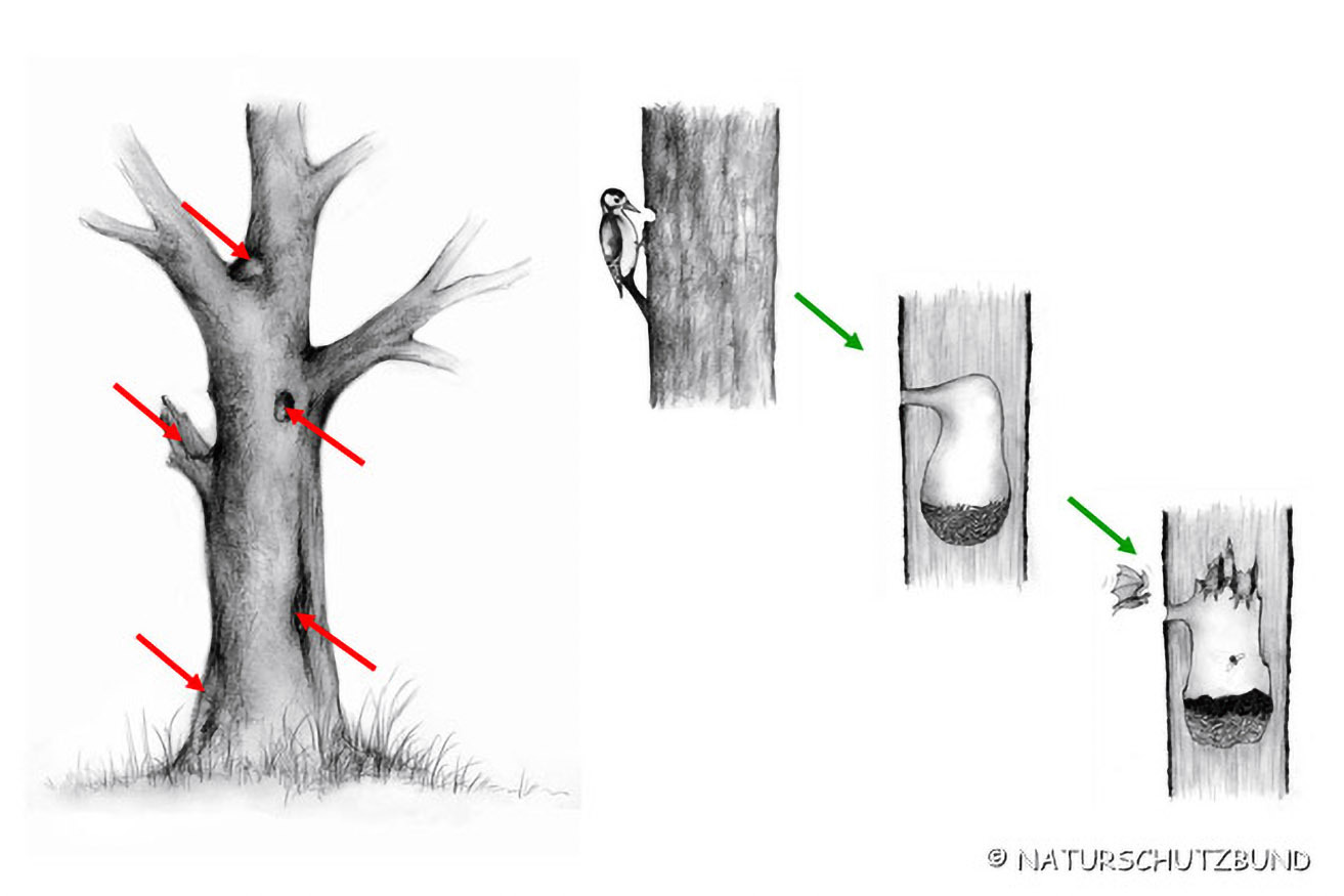 Auch alte, manchmal schon abgestorbene Bäume bieten Fledermausquartiere. Als solche werden nicht nur oberhalb vom Einflugloch ausgefaulte Spechthöhlen genutzt, sondern auch diverse andere Löcher und Spalten.