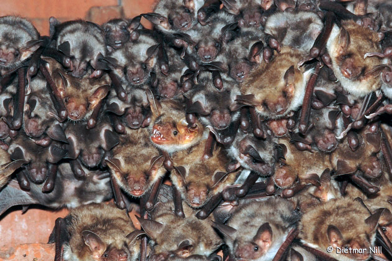 Wochenstuben dieser Art können mehrere Hundert Tiere umfassen. Die bräunlichen Individuen am Bild sind Weibchen, die gräulichen Jungtiere.