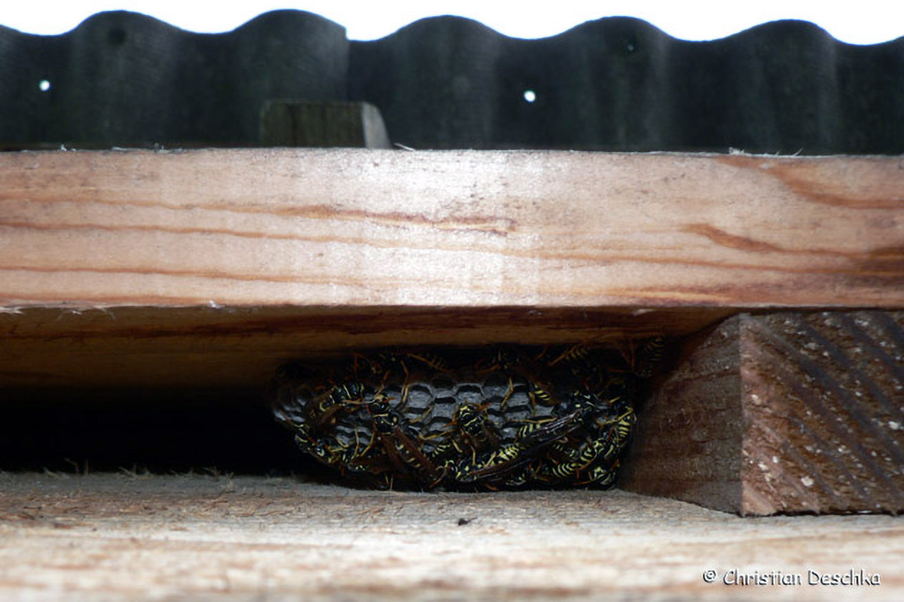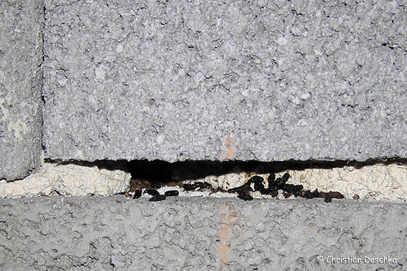 Feldwespen bauern ihr Nest nur ausgesprochen selten in die spaltenförmigen Hohlräume. Diese werden aber regelmäßig von Stubenfliegen zum Überwintern genutzt. Seit Herbst 2009 finden wir auch Asiatische Marienkäfer.