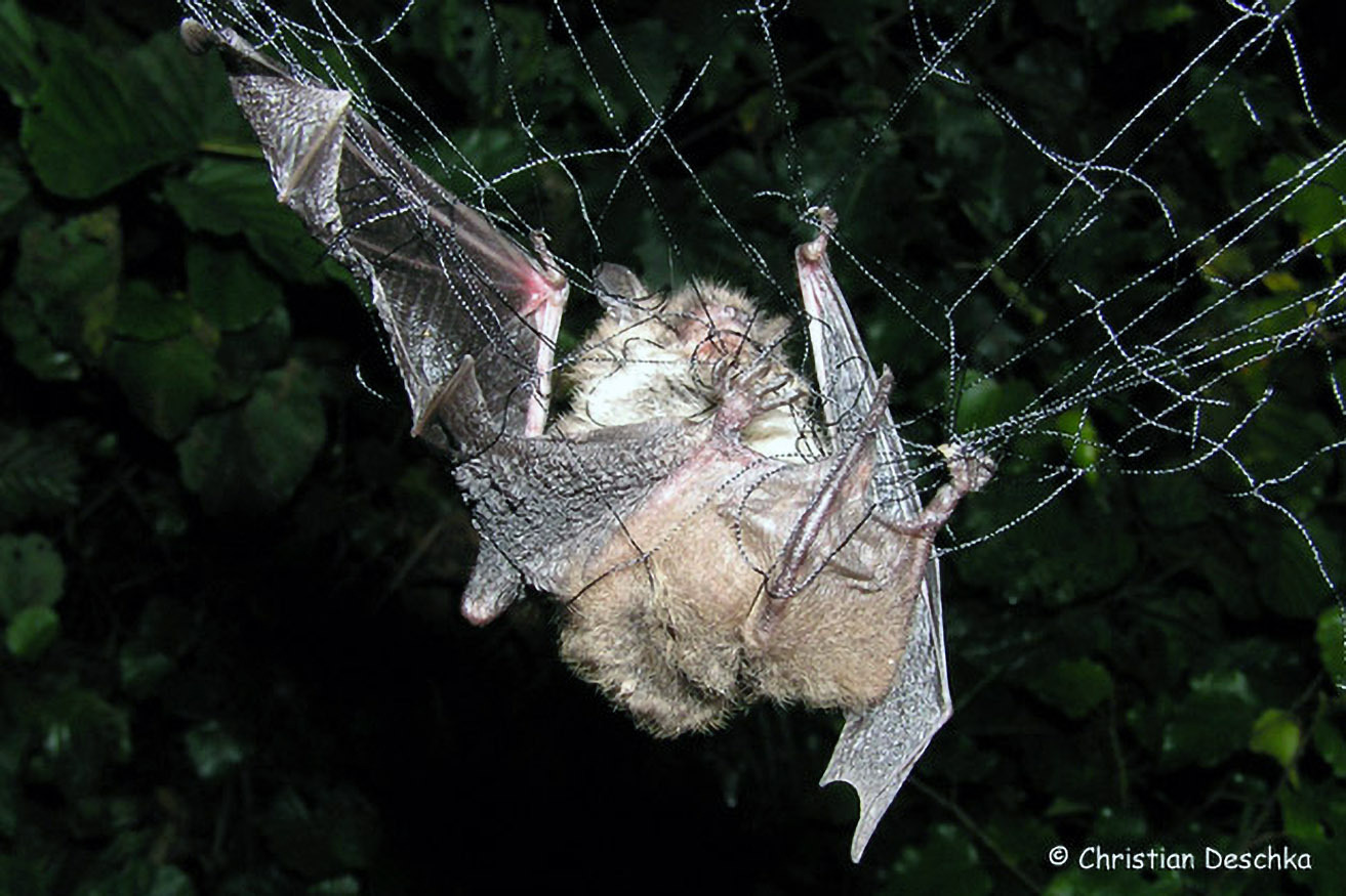 Dabei bleiben sie mitunter selber kleben und verenden qualvoll. In diesem Fall wurde eine Kleine Bartfledermaus von diesem Schicksal ereilt.