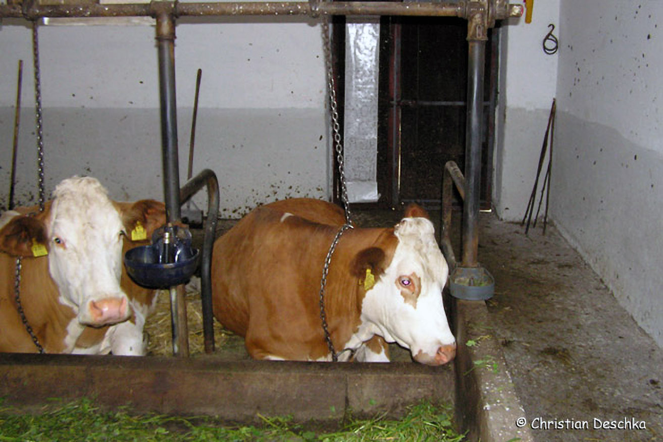 Manche Fledermausarten fliegen zum Jagen auch in Kuhställe, wo es zumeist viele Fliegen gibt. Dabei sammeln sie auch halbtote Fliegen von Fliegenklebestreifen. Ein solcher ist im Hintergrund auf der Stalltür zu sehen.