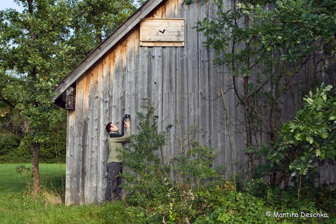 Die Mopsfledermaus hat aber auch gelernt, Verstecke an menschlichen Gebäuden zu nutzen. Wo sie dies regelmäßig tut, sind manchmal weißliche Spuren zu finden.
