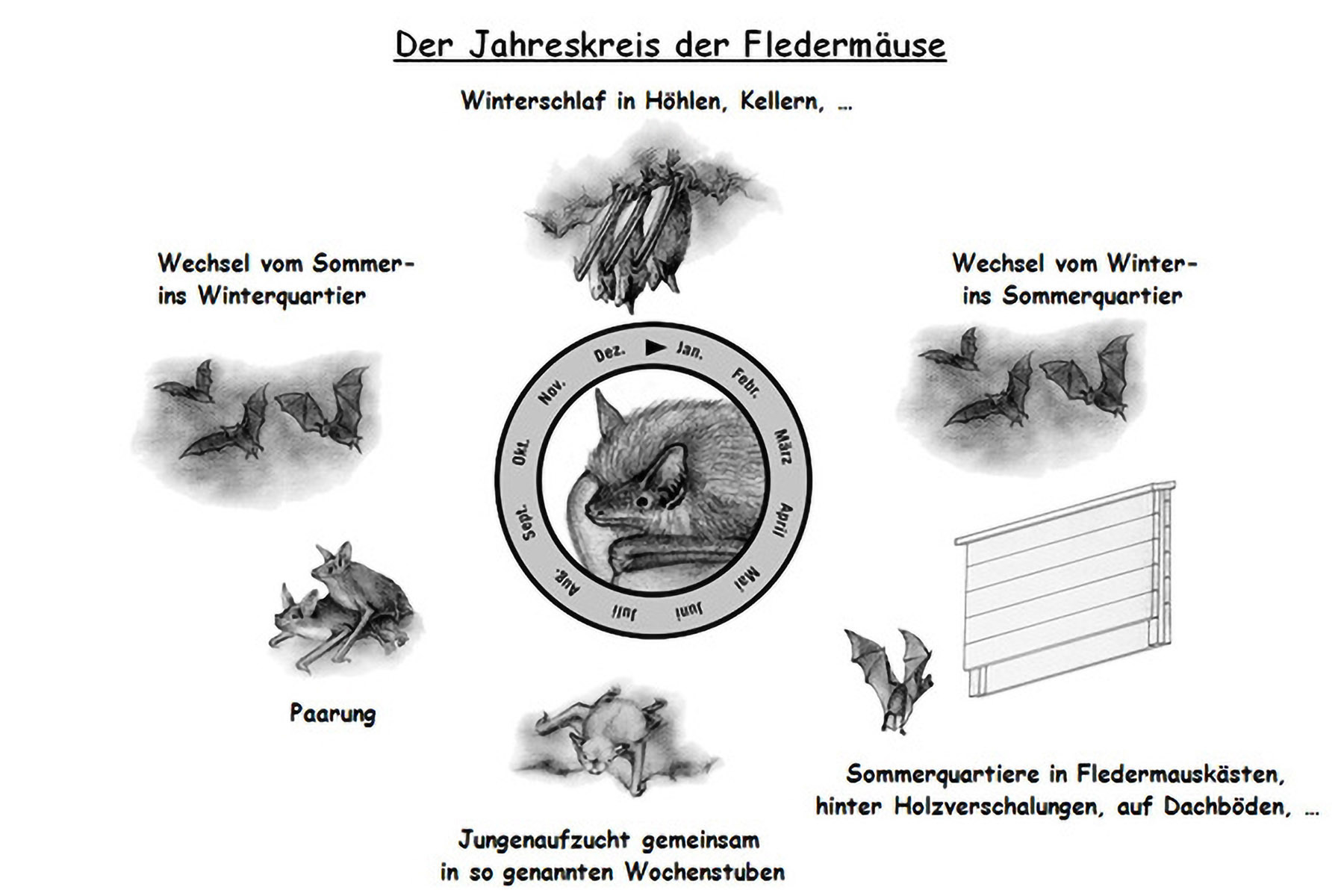 Die Fledermauskästen werden frühestens im Februar, meist aber erst im März und April bezogen. Im Oktober und November verschwinden die Tiere wieder in die Winterquartiere. Mops- und Zweifarbfledermäuse verweilen am längsten.