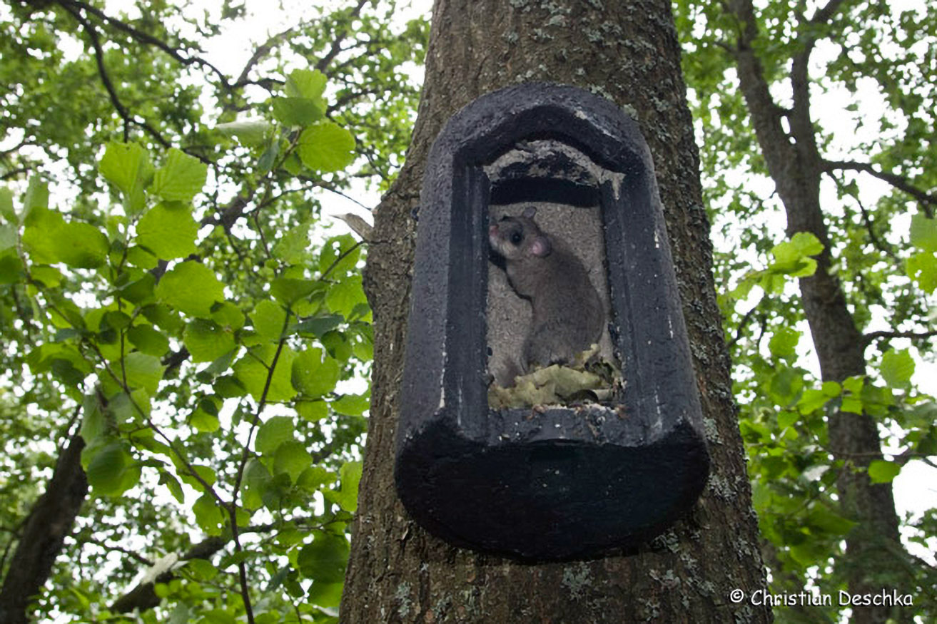 Auch in der Nähe des Fundortes der Bechsteinfledermaus brachten wir an alten Eichen auch Schwegler-Kästen an. Zunächst wurden diese nur von Spinnen, Schnecken, Asseln etc. besiedelt. Bald zogen auch Siebenschläfer ein.