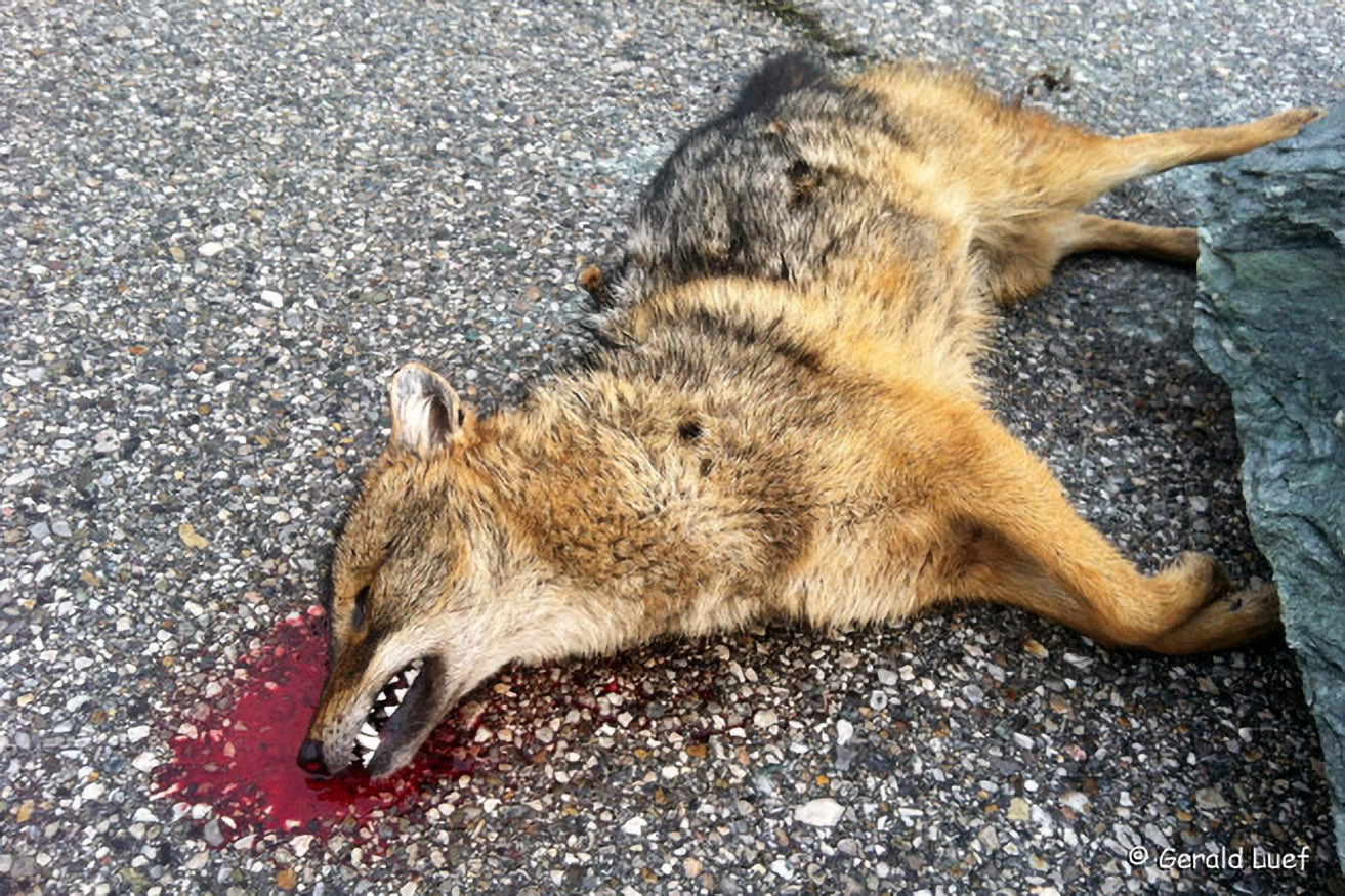 Dabei dürften Goldschakale nicht selten Opfer des Straßenverkehrs werden. Dieses Exemplar wurde Anfang 2012 in Wr. Neudorf (NÖ) bei der Kollision mit einem Auto getötet.
