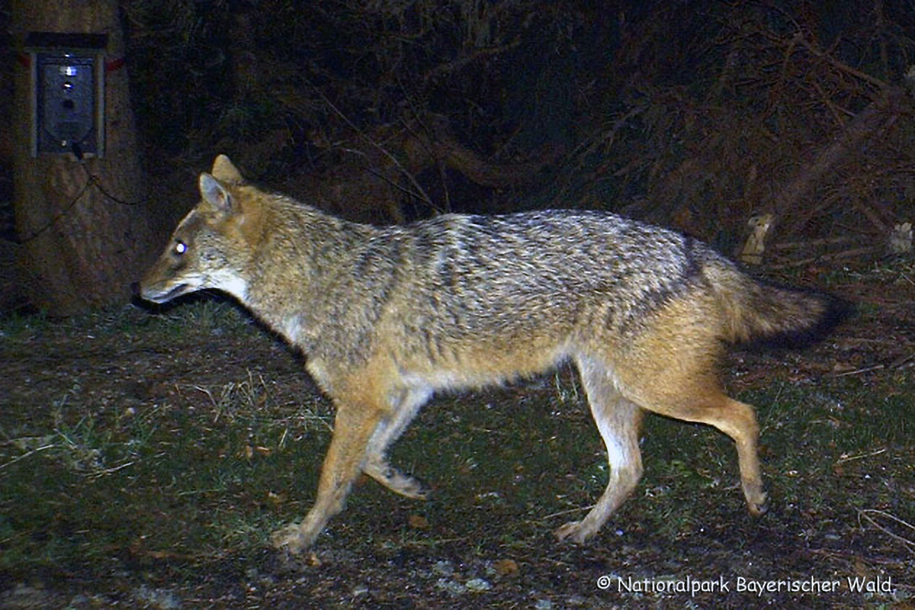 Dieser Goldschakal wurde am 26.04.2011 im Nationalpark Bayerischer Wald im Landkreis Freyung-Grafenau auf einem Forstweg von einer Fotofalle abgelichtet. Es handelte sich dabei wohl um einen Durchzügler.