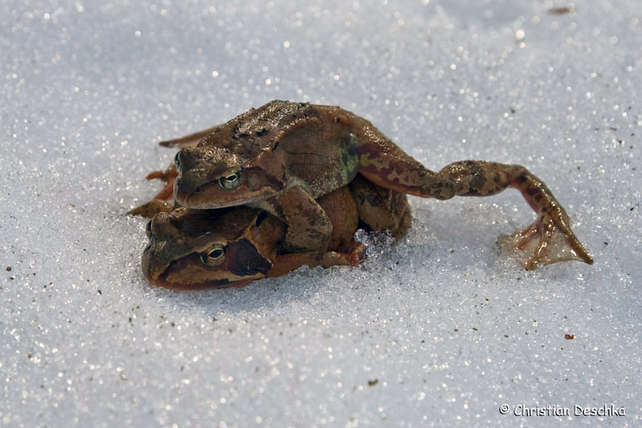Im zeitigen Frühling machen sie sich auf zu den Laichgewässern. Die Männchen versuchen bereits am Weg dorthin ein Weibchen zu ergattern und lassen sich von diesem huckepack tragen.
