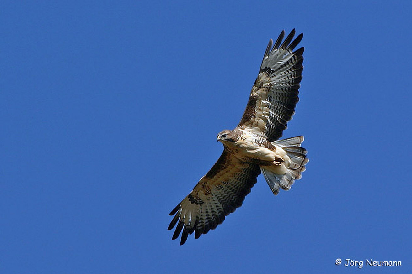 Der Mäusebussard ist einer der häufigsten und am weitesten verbreiteten Greifvögel im Mühlviertel. Im Segelflug ist er an den breiten Flügeln und dem relativ kurzen, breit gefächerten Schwanz erkennbar.