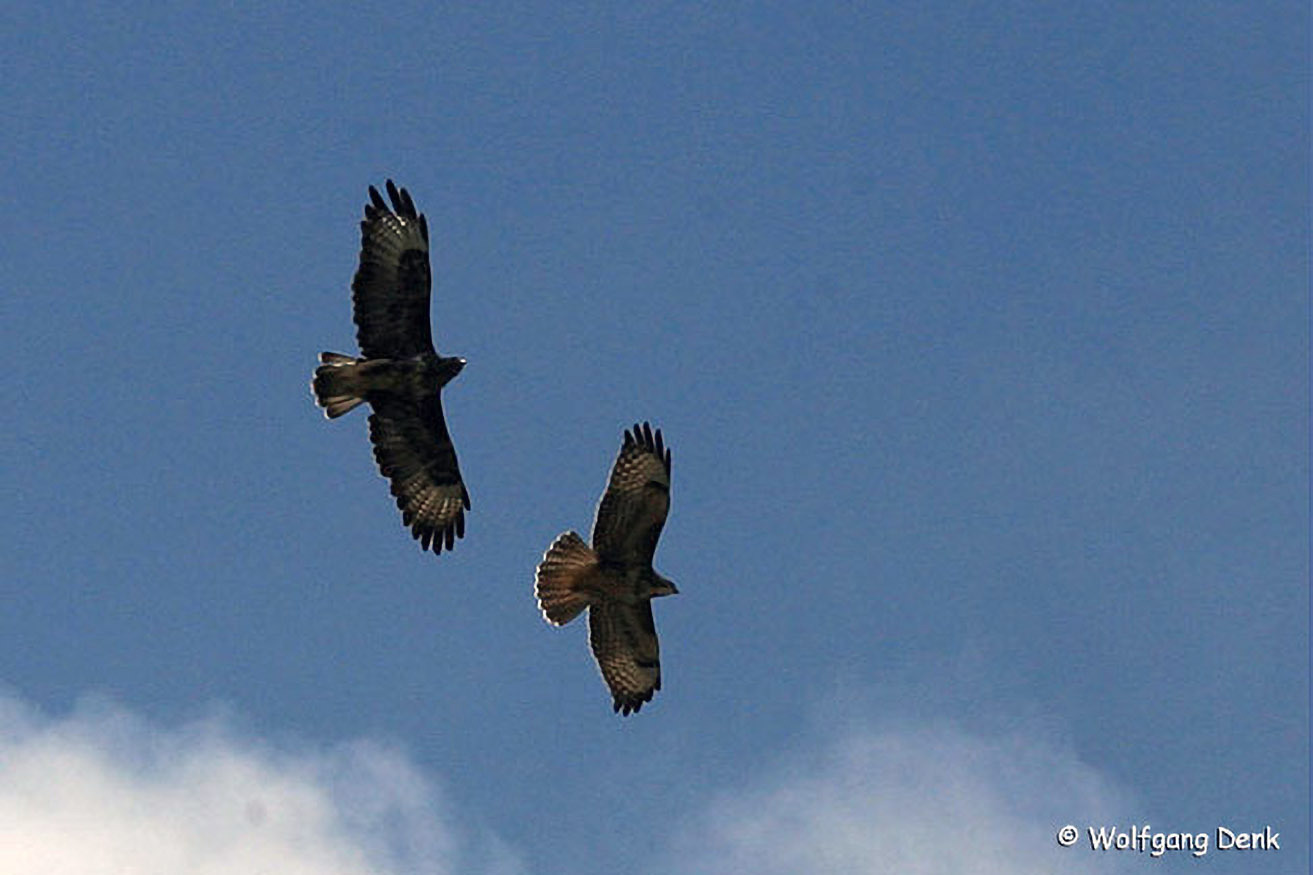 Mäusebussarde grenzen - wie alle bei uns heimischen Arten - Reviere ab. Im Frühling kann man sie daher paarweise und oft von HIÄH-Rufen begleitet beim Balzflug über ihrem Revier beobachten. Weibchen sind etwas größer als Männchen.