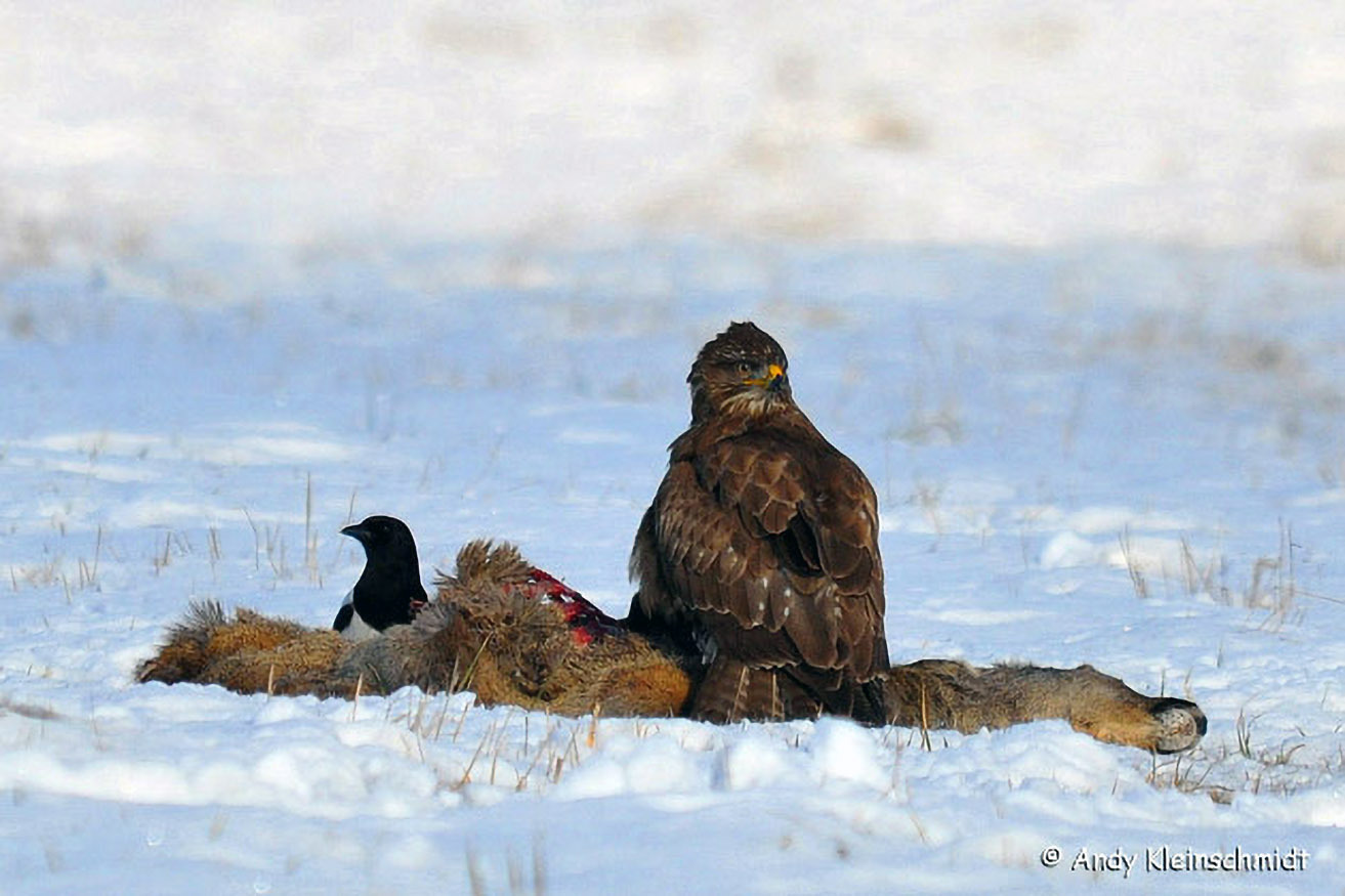 Im Winter verstreichen Bussarde z.T. in schneearme Niederungen. Gerne halten sie sich an Straßenrändern auf, wo Aas von Verkehrsopfern zu finden ist. Ein Teil unserer Mäusebussarde zieht Richtung Südwesten, dafür kommen Nordeuropäer zu uns.