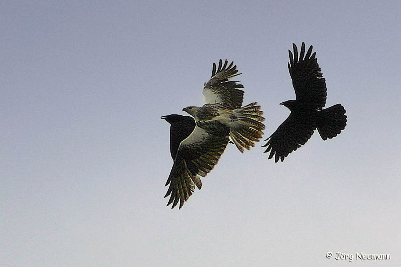 Wie alle Greifvögel werden auch Mäusebussarde oft von anderen Vögeln attackiert und nach Möglichkeit verscheucht. Hier hassen zwei Rabenkrähen auf einen Mäusebussard.