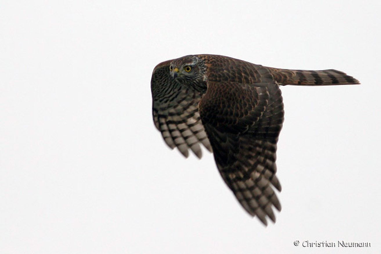 Im freien Luftraum sieht man den Habicht ausgesprochen selten. Man erkennt ihn dann am langen Stoß, der deutlich länger ist, als die Schwingen breit sind.