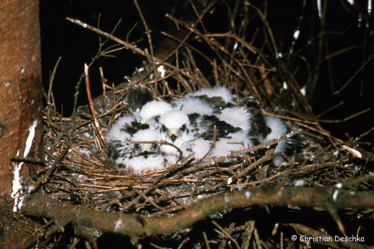 Die Küken werden also fast ausschließlich vom größeren, stärkeren Weibchen erbrütet und anschließend betreut und bewacht. Erst wenn diese rund 3 Wochen alt sind, fliegt auch das Weibchen wieder auf die Jagd.