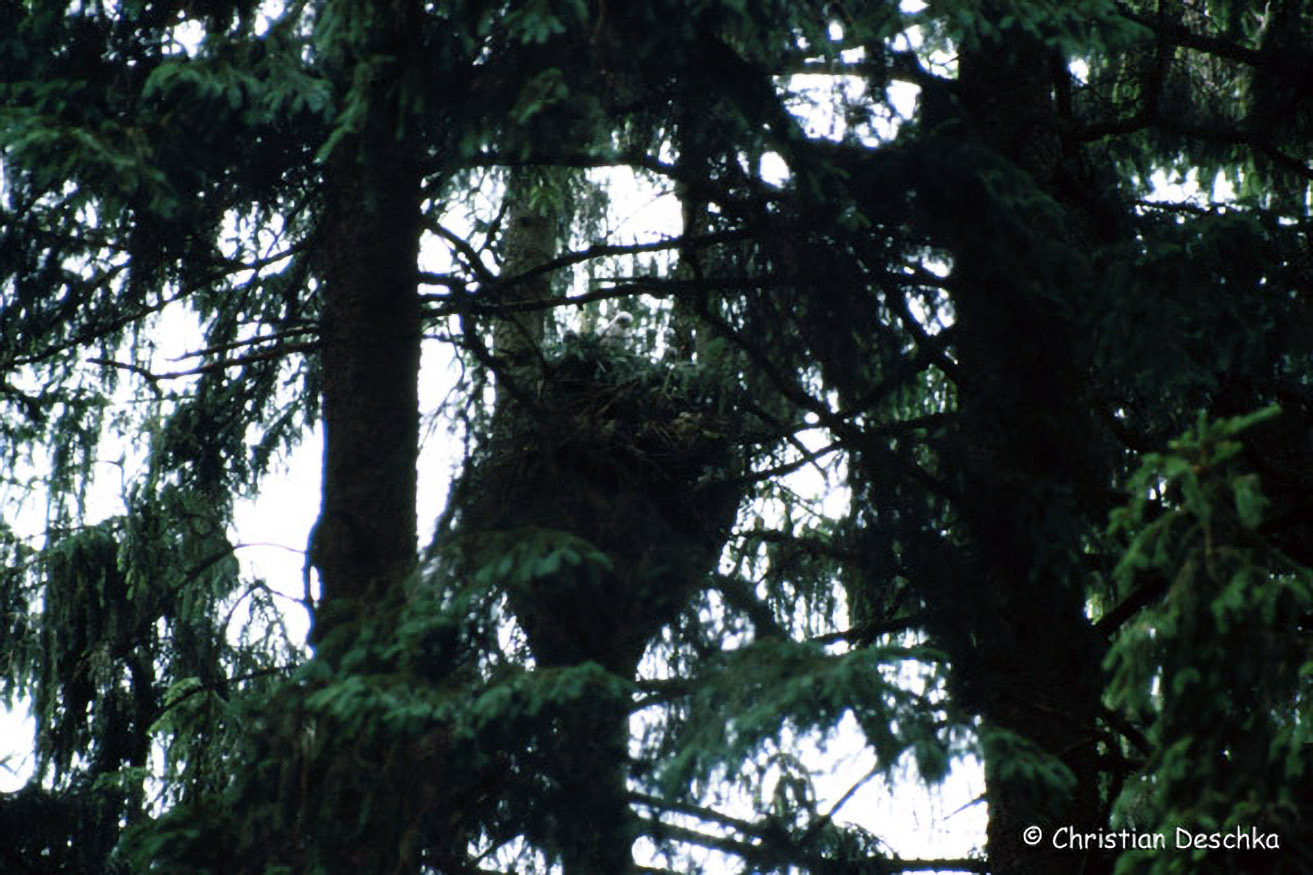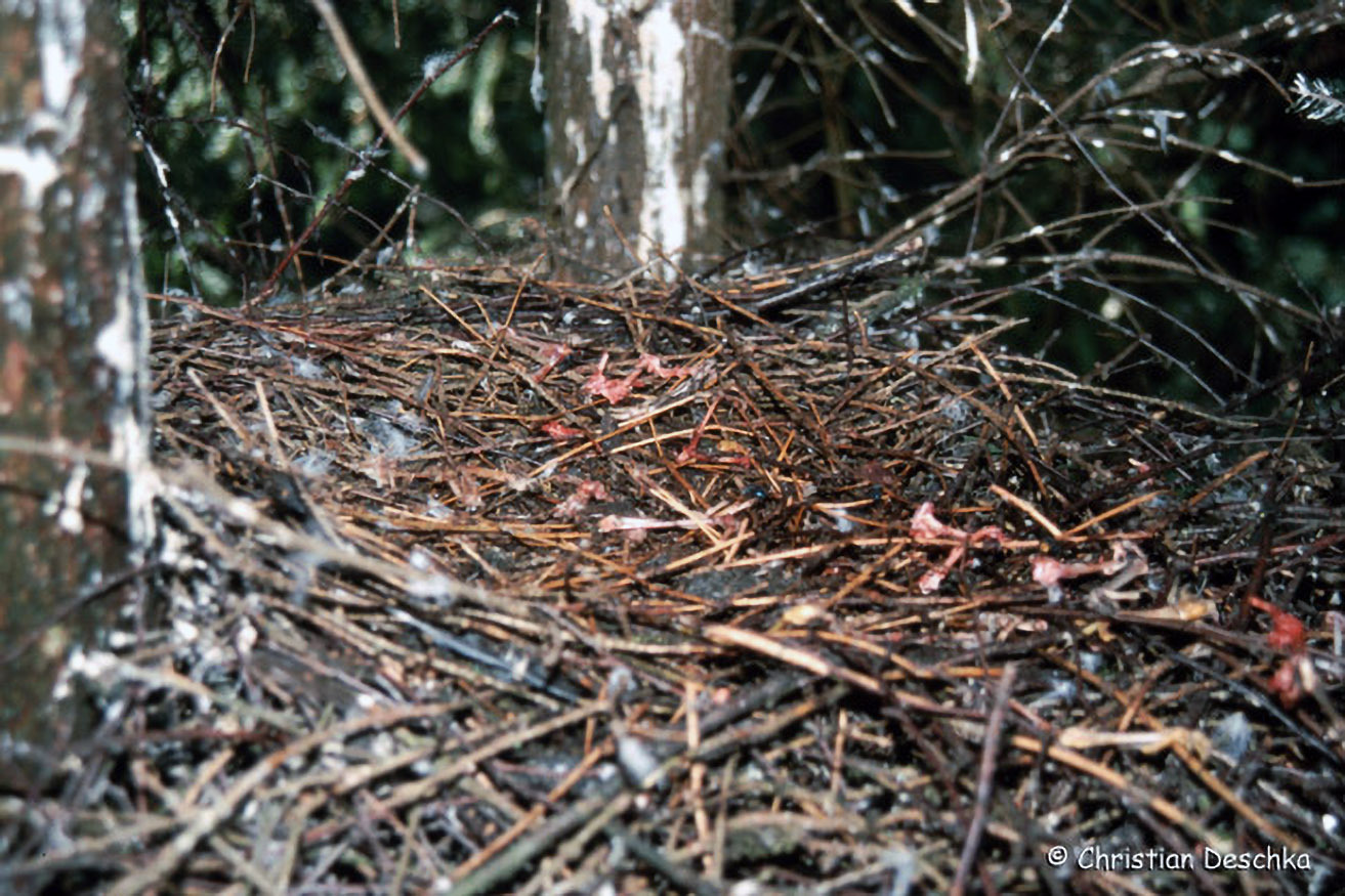 Habichte errichten ihre Horste gerne in "Zwieseln". Wird der gleiche Horst mehrere Jahre verwendet und ausgebaut, entstehen eindrucksvolle Bauten. Nicht selten wird aber auch in der Nähe ein neuer Horst errichtet.