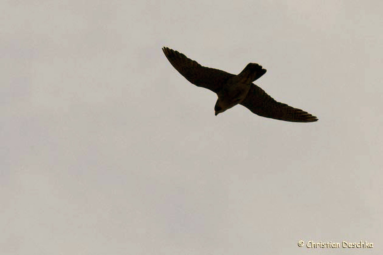 Lange, schmale und sichelförmige Schwingen und ein relativ kurzer Stoß sind die Kennzeichen des Baumfalken. Bei guten Lichtverhältnissen sieht man auch den Backenstreif, die dunklen Flecken am Bauch und den orangen "Hintern".
