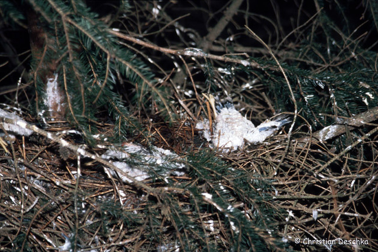 In der folgenden "Bettelflugphase" werden die unerfahrenen Jungvögel noch von den Eltern versorgt. Das Nest dient weiterhin als Futterstelle. Übrig bleiben zahlreiche Vogelknochen.
