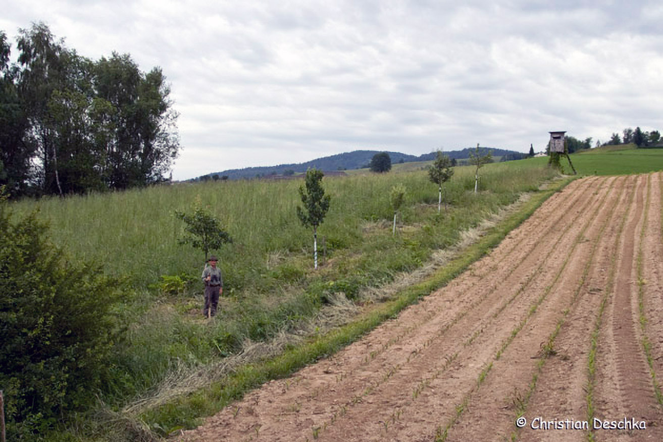 Dieser Revierteil wurde vom selbigen Jäger durch eine Baumreihe aus alten, gefährdeten Obstbaumsorten aufgewertet.