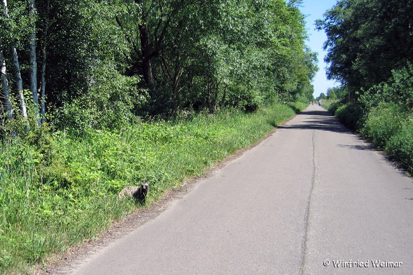 Möglicherweise hast du eine überraschende Begegnung mit einem fuchsgroßen, dir unbekannten Tier. Dann könnte es sich wie hier um einen Marderhund handeln, von dem gelegentlich Exemplare bei uns auftauchen.