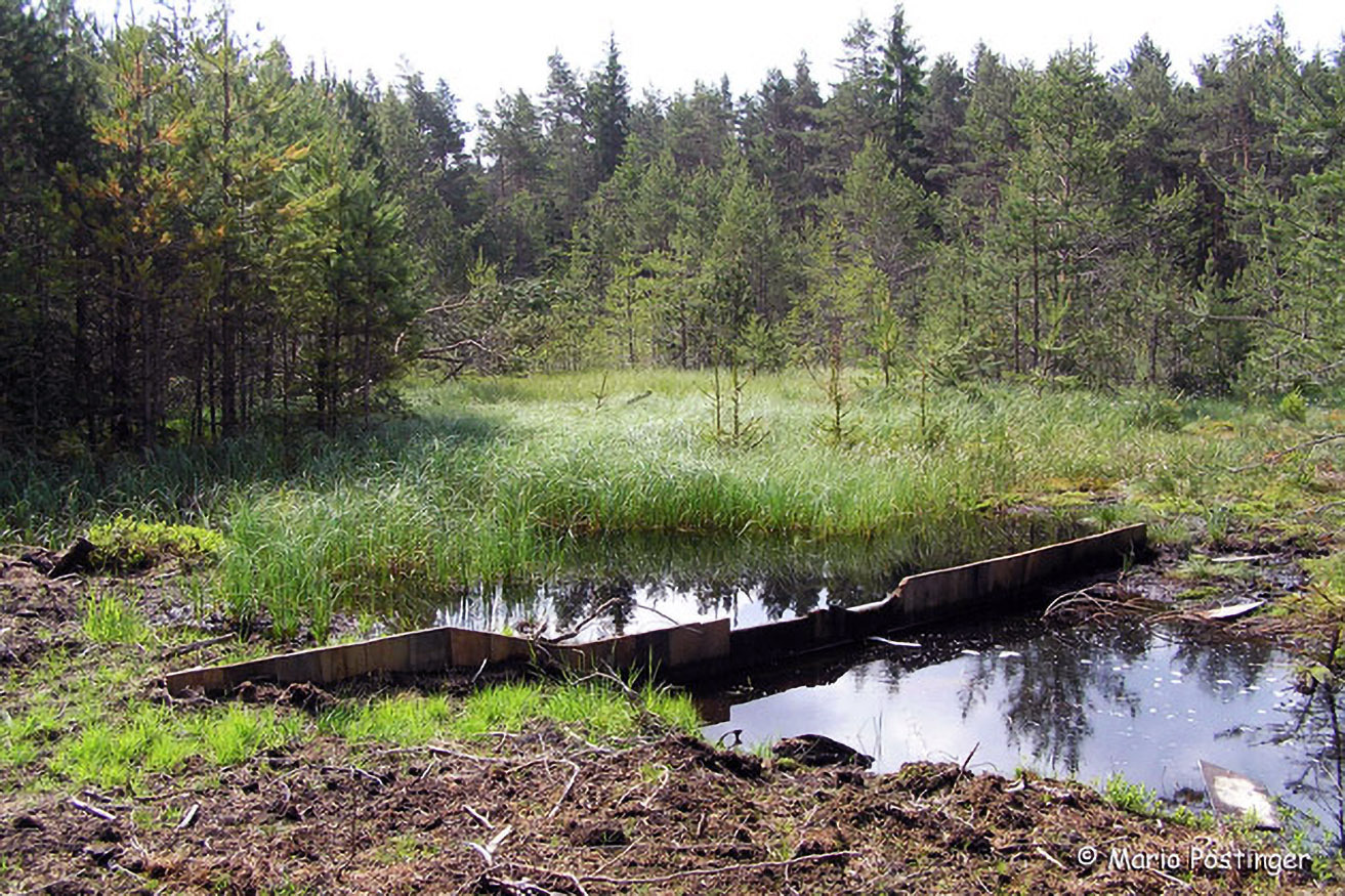 Richtig platziert kann im ebenen Gelände mit nur einer einzigen Grabensperre eine beachtliche Moorfläche wiedervernässt werden. Unter solchen Voraussetzungen reagiert auch die Vegetation sehr rasch auf die positive Veränderung.