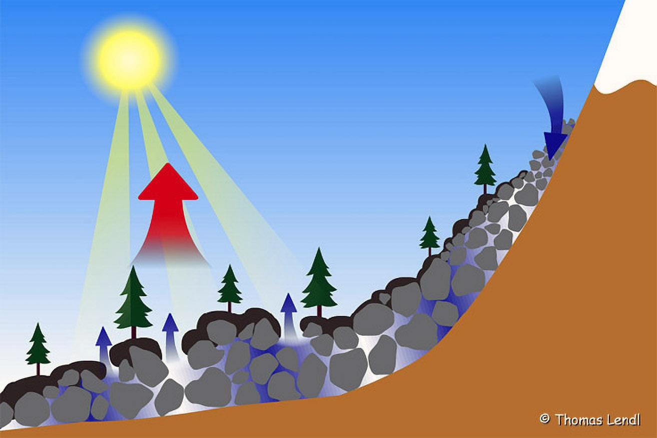Im Bereich von Kaltluftaustritten kondensiert Wasser und bildet ein feuchtes Kleinklima. An diesen Stellen können sich dicke Torfmoospölster ausbilden, die letztlich ineinander wachsen und die Halde überdecken.