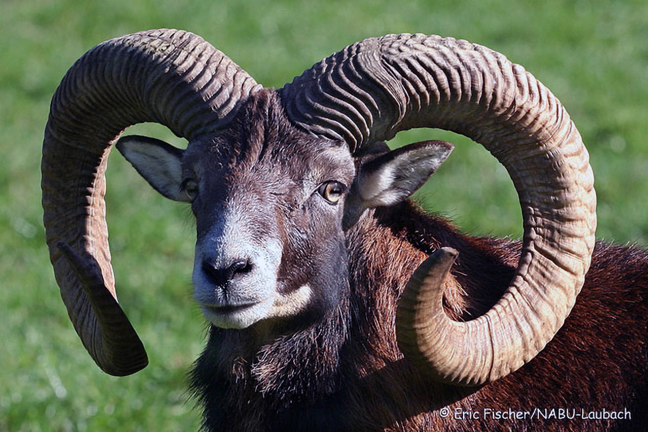 Alte Widder tragen oft recht imposante Schnecken, die begehrte Trophäen sind. Bei diesem Porträt sehen wir auch gut den weißlichen Windfang und Äser sowie die hellen Lichter mit waagrechter Pupille.