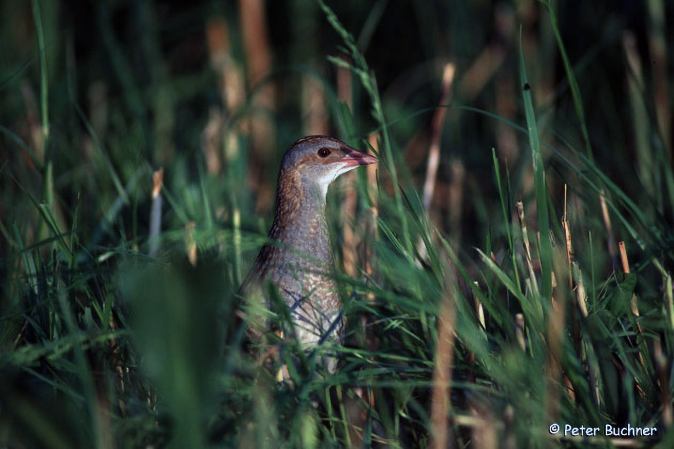 Der Wachtelkönig lebt in Wiesen, die am Boden zwar Platz zum Laufen, nach oben aber viel Deckung bieten. Er ist mit ein paar verbliebenen Brutpaaren einer unserer seltensten Vögel überhaupt.