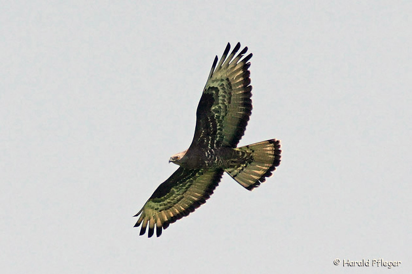 Dieser bräunliche Greif hat zumeist einen hellen Brustfleck. Der Schwanz weist 5-6 schmale Querbinden auf.