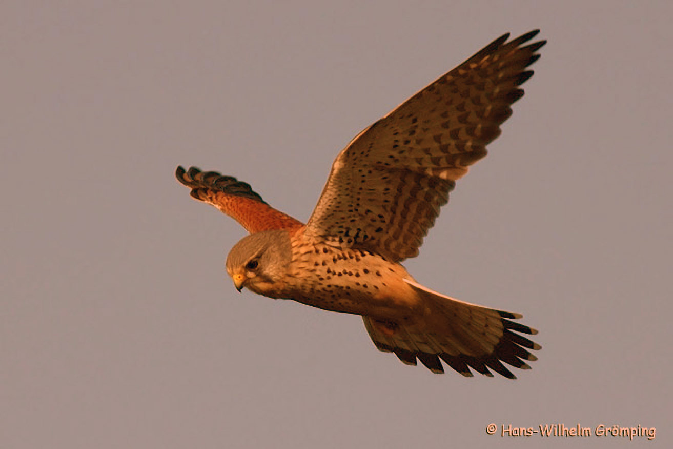 Der "Rüttelflug" macht den Turmfalken unverkennbar. Dabei steht er an einem Punkt in der Luft, schlägt mit den Schwingen und hält nach Mäusen, Insekten, Regenwürmern, ... Ausschau.