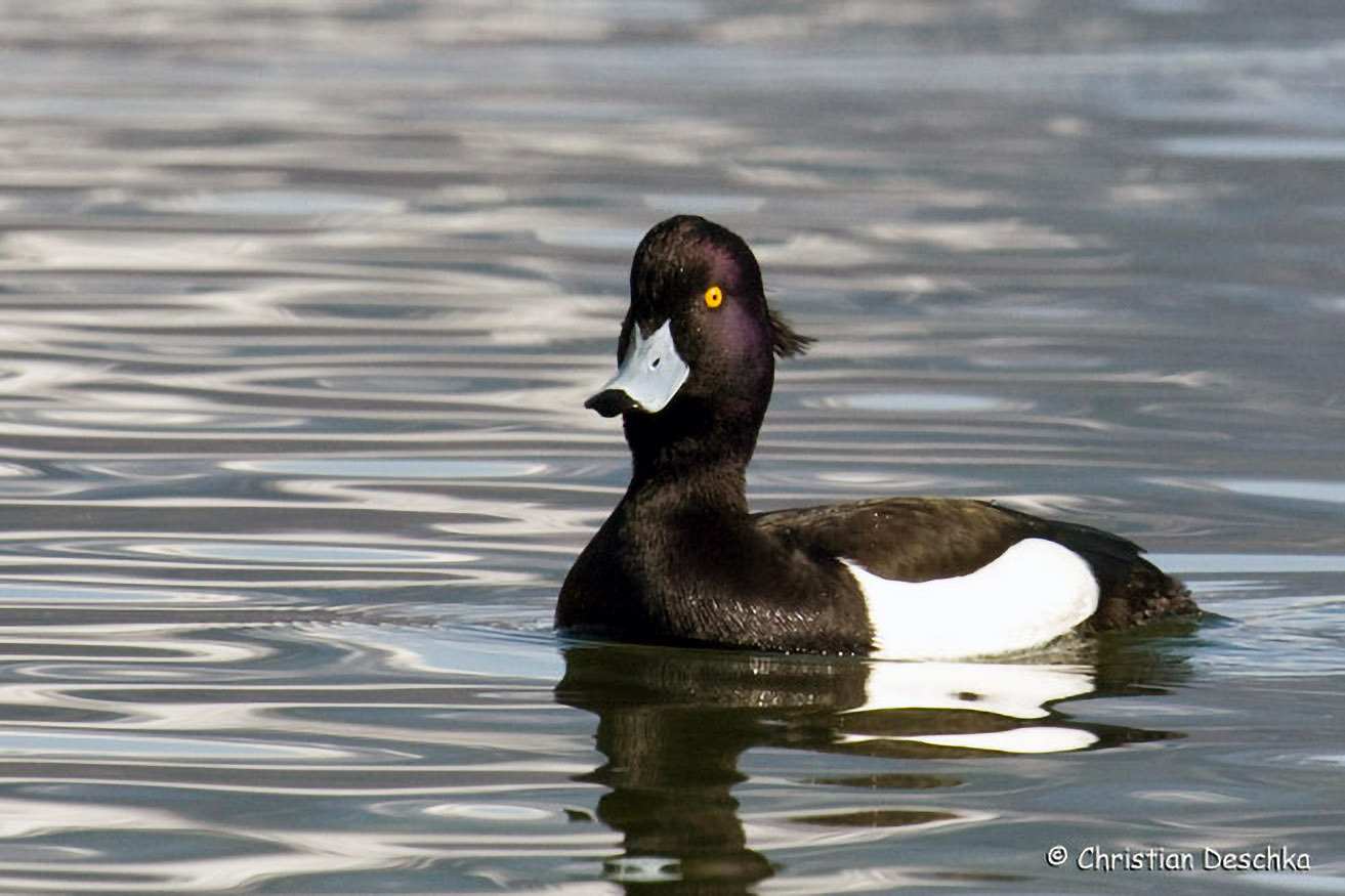 Die Reiherente ist nach der Stockente unsere zweithäufigste Entenart. Sie ist an langsam fließenden Gewässern, Seen und vom Menschen angelegten Teichen zu finden. Dort kann man sie beim Tauchen nach Nahrung beobachten.