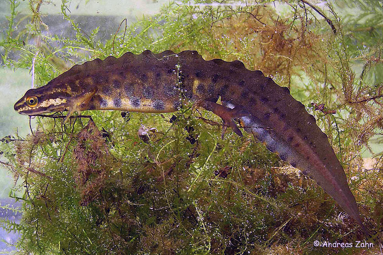 Der Kammmolch ist im Frühling am Rückenkamm und dem weißen Streifen am Schwanz erkennbar. Er bewohnt vor allem größere und tiefe Gewässer mit ausgeprägtem Bewuchs an Wasserpflanzen. An diesen legt er die Eier ab.