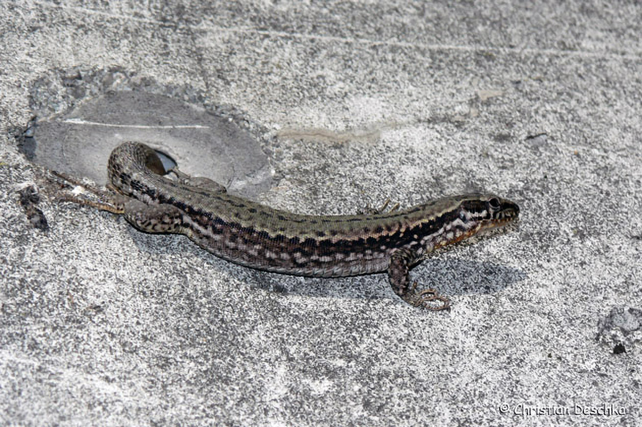 Diese Mauereidechse klettert gerade aus einem Mauerloch und wird damit ihrem Namen gerecht. Diese schlanke Eidechse kommt nur an steilen, felsigen und spärlichst bewachsenen Abschnitten im Donauraum vor.