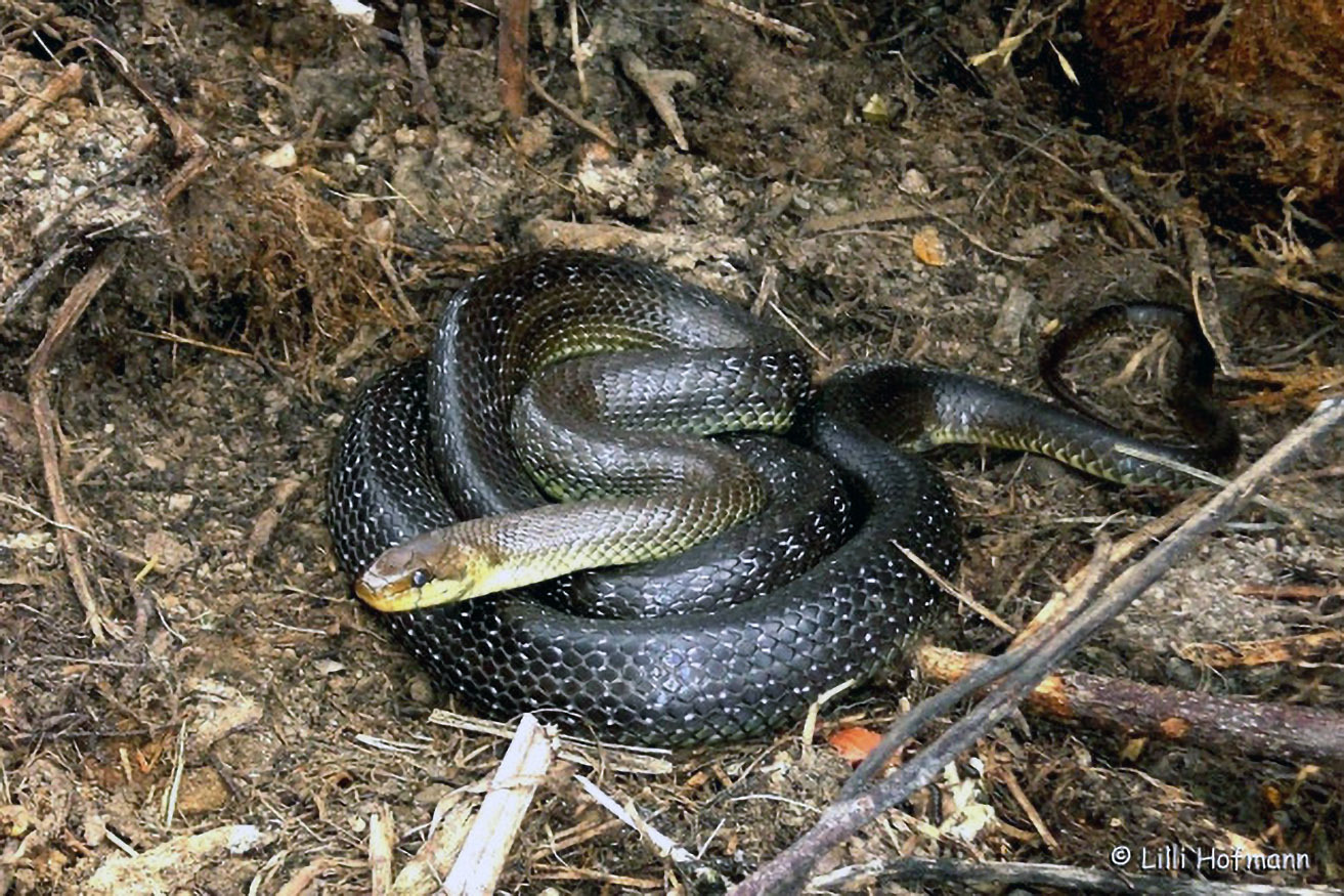 Die Ringelnatter ist an den zwei gelblichen Flecken hinter dem Kopf leicht erkennbar. Sie ist unsere häufigste Schlange und in stehenden Gewässern regelmäßig auf der Jagd zu beobachten.