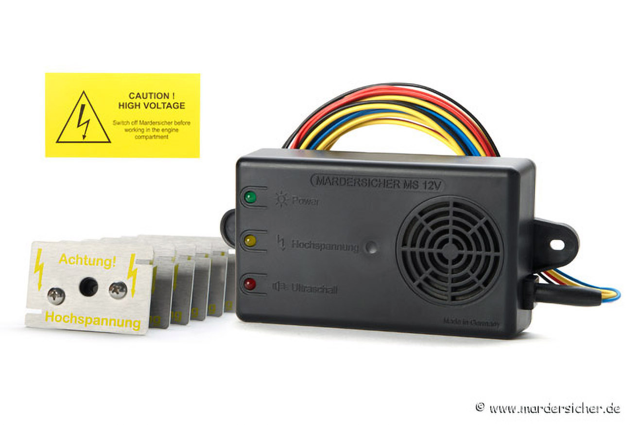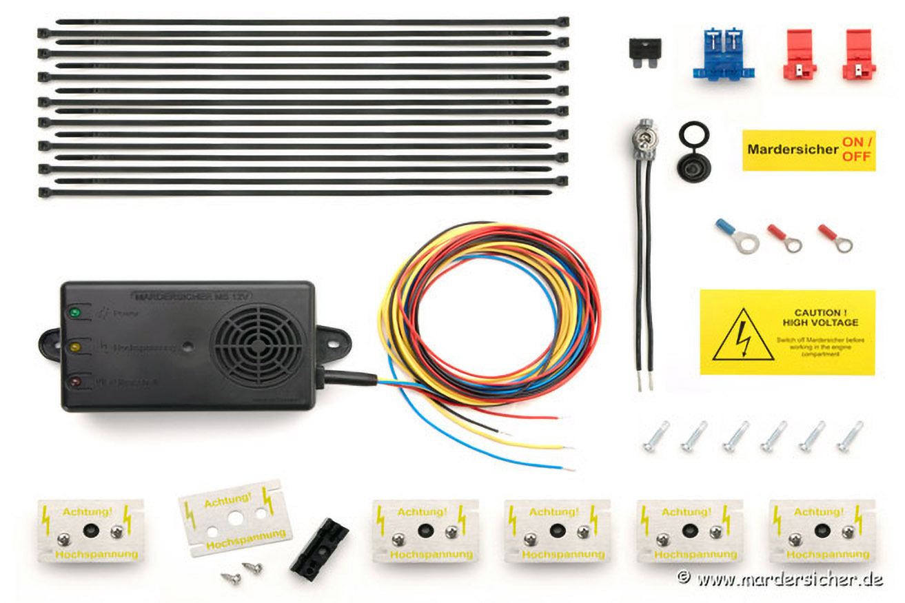 Bestens bewährt haben sich die hochwertigen Produkte der deutschen Firma "Mardersicher". Diese Abbildung zeigt den Lieferumfang des besonders empfehlenswerten Gerätes "MS 12V Mobil".