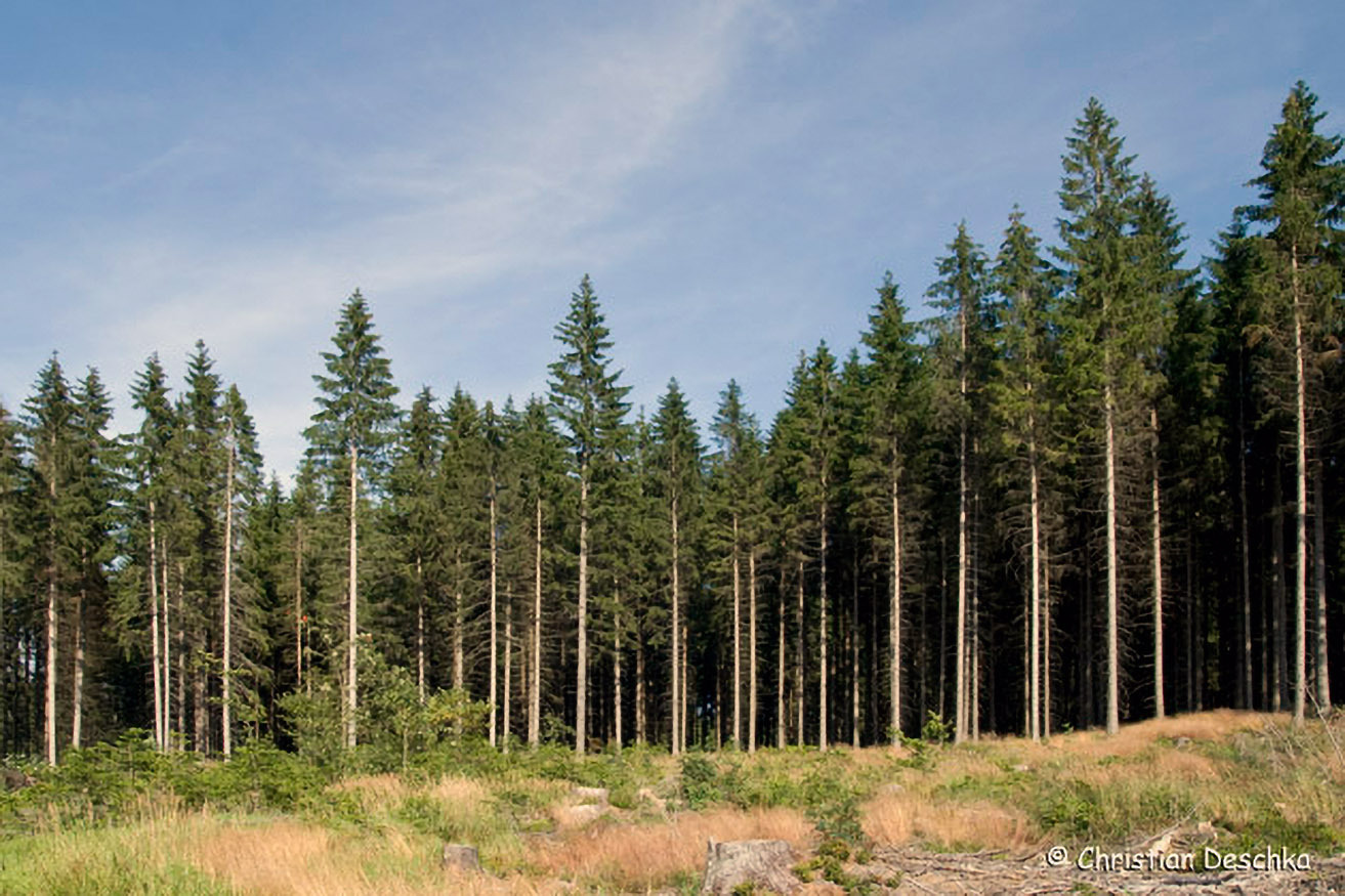 Der erste Abschnitt des Weges führt durch in dieser Gegend leider sehr weitverbreitete Fichtenmonokulturen. Die gleich alten Bäume bilden instabile Bestände ("Altersklassenwald") und sind anfällig für Borkenkäfer und Windwürfe.