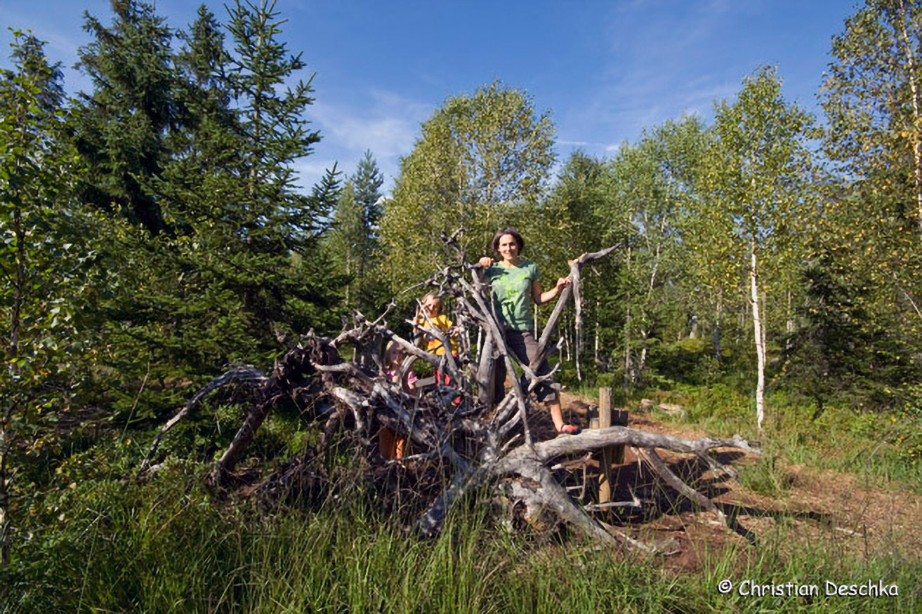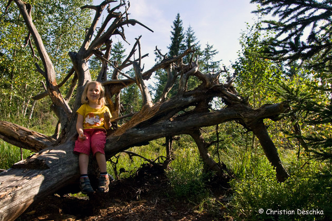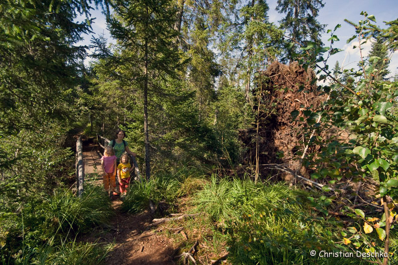 An dieser entwurzelten Fichte können wir den hohen Wasserstand im Moor sehen. Wo früher das flache Wurzelteller war, ist jetzt ein kleiner Tümpel - Lebensraum für Amphibien, Libellen, ...