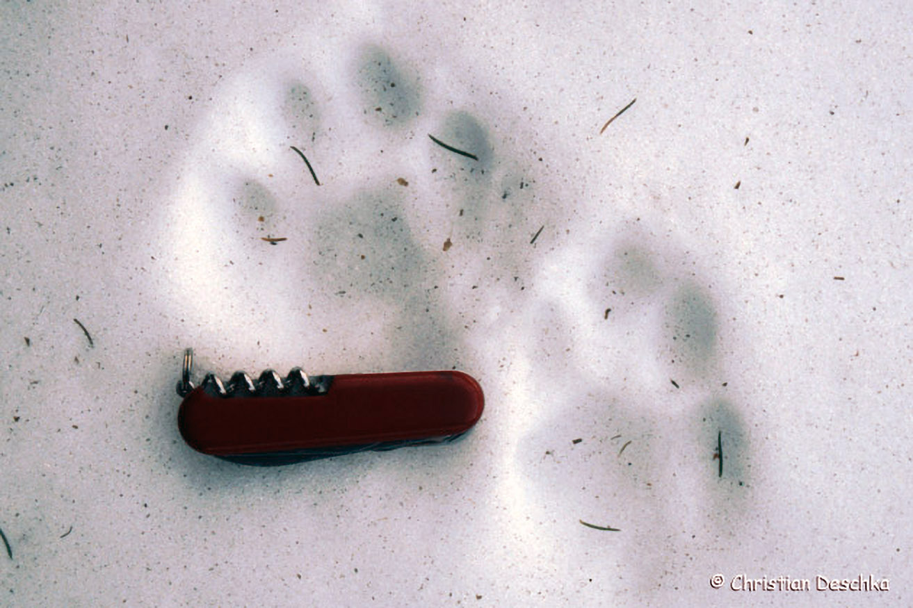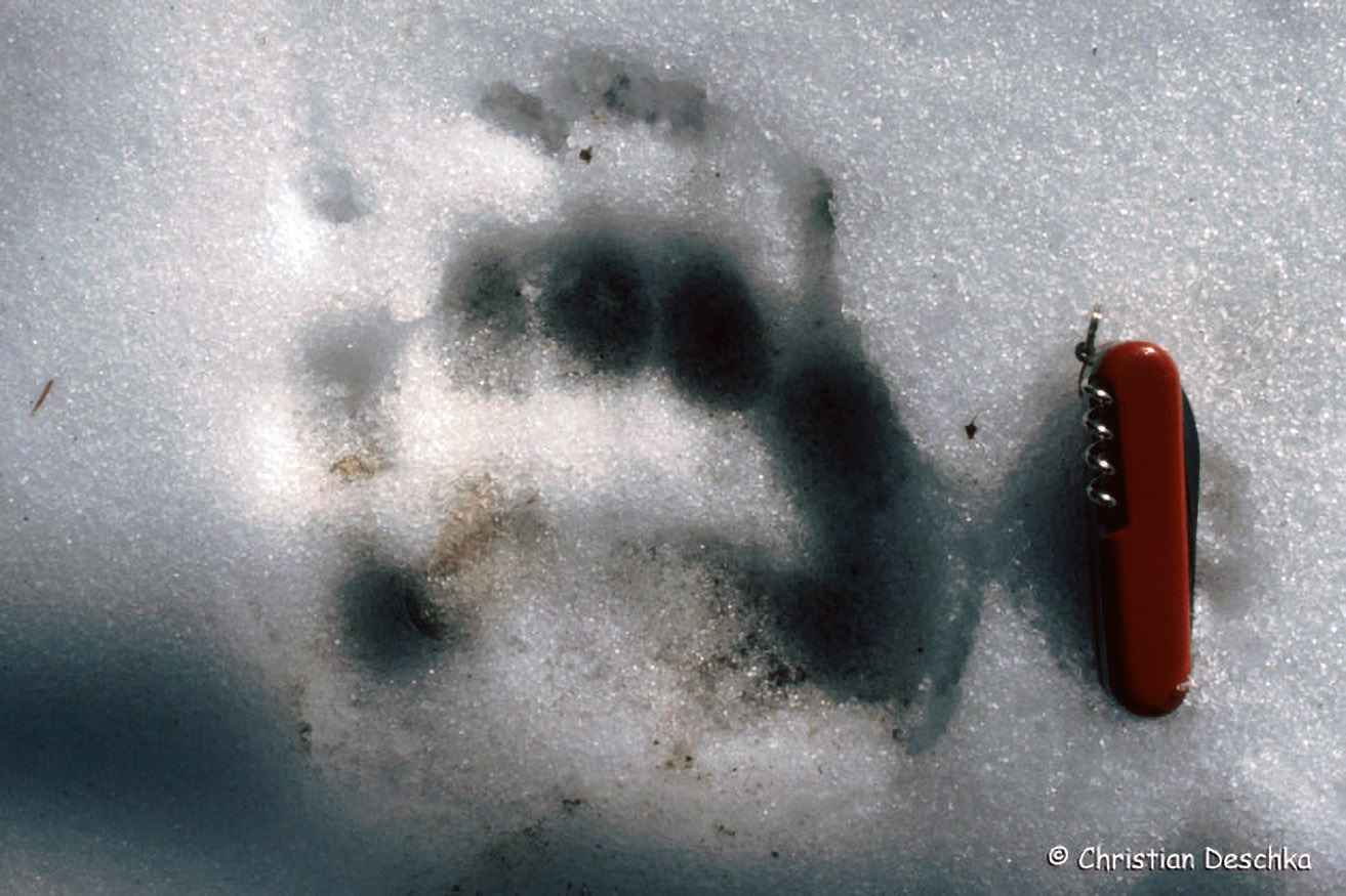 Hier sehen wir einen Abdruck der Braunbären-Vorderbrante. Da der Fersenballen wie fast immer fehlt, ist das Trittsiegel breiter als lang.