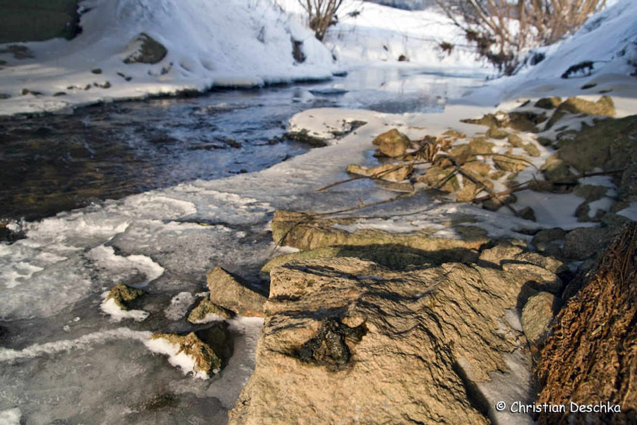 Der Fischotter wechselt bei der Fortbewegung ständig zwischen Wasser und Land. Geht man einen Bach entlang, findet man viele Ein- und Ausstiege, aber auch Plätze, an denen er sich gewälzt und/oder markiert hat.
