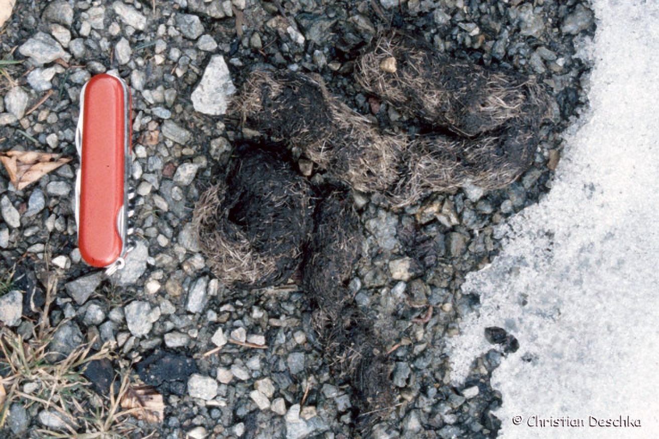 Die Losung des Fuchses kann sehr unterschiedlich aussehen. Die gewellten Rehhaare verraten, dass der Fuchs hier wohl Fallwild gefressen hat.