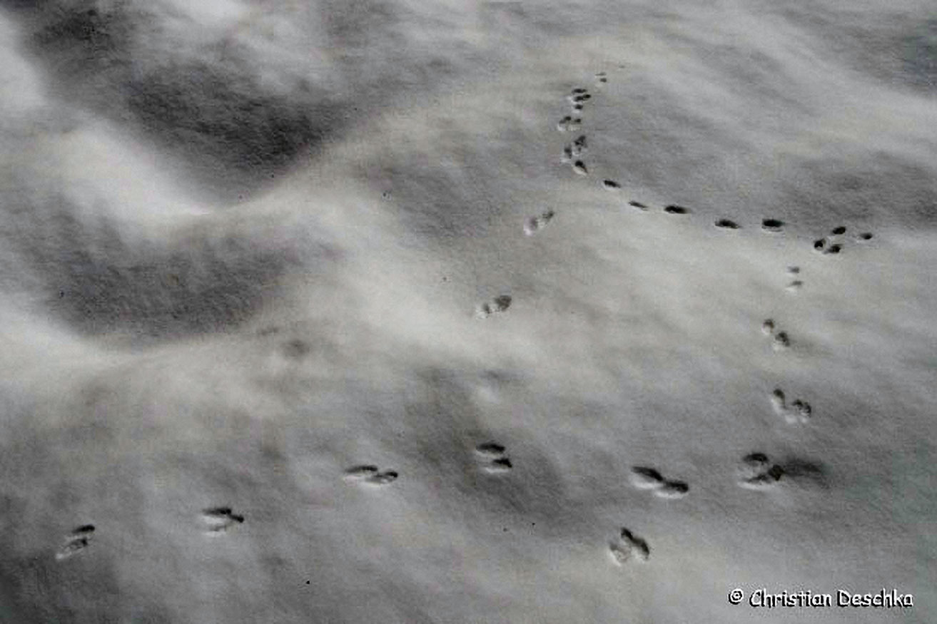 Im Wald findet man im Winter regelmäßig die Spuren von Waldmäusen. Im Trittsiegel des Vorderfußes zeichnen sich vier stark spreizbare Zehen ab. Der längliche Hinterfußabdruck weist fünf Zehen auf.