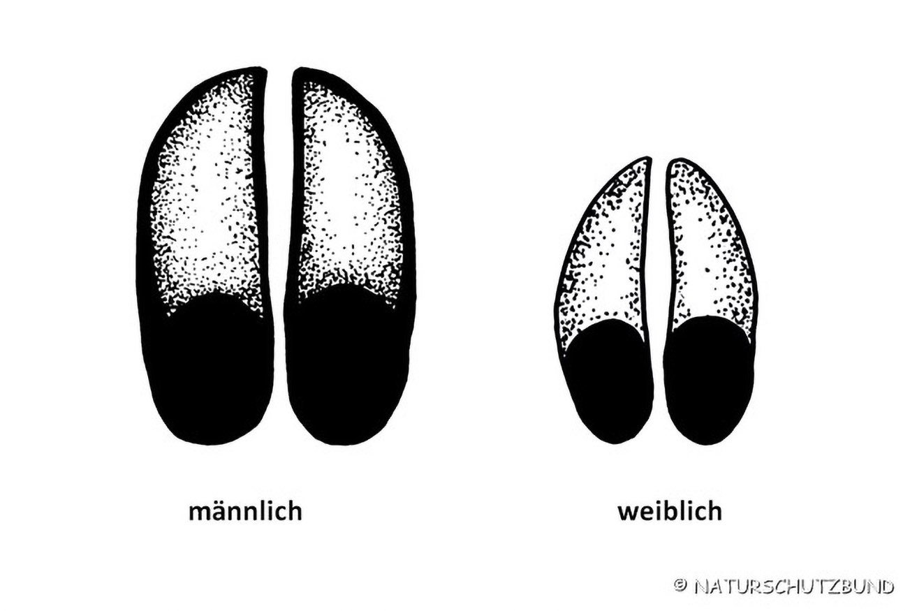 Rothirsche hinterlassen relativ große Abdrücke, in denen die Ballen rund ein Drittel der Länge einnehmen. Beim Hirsch sind die Hufränder eher parallel. Beim Tier sind die Trittsiegel oft eiförmig.